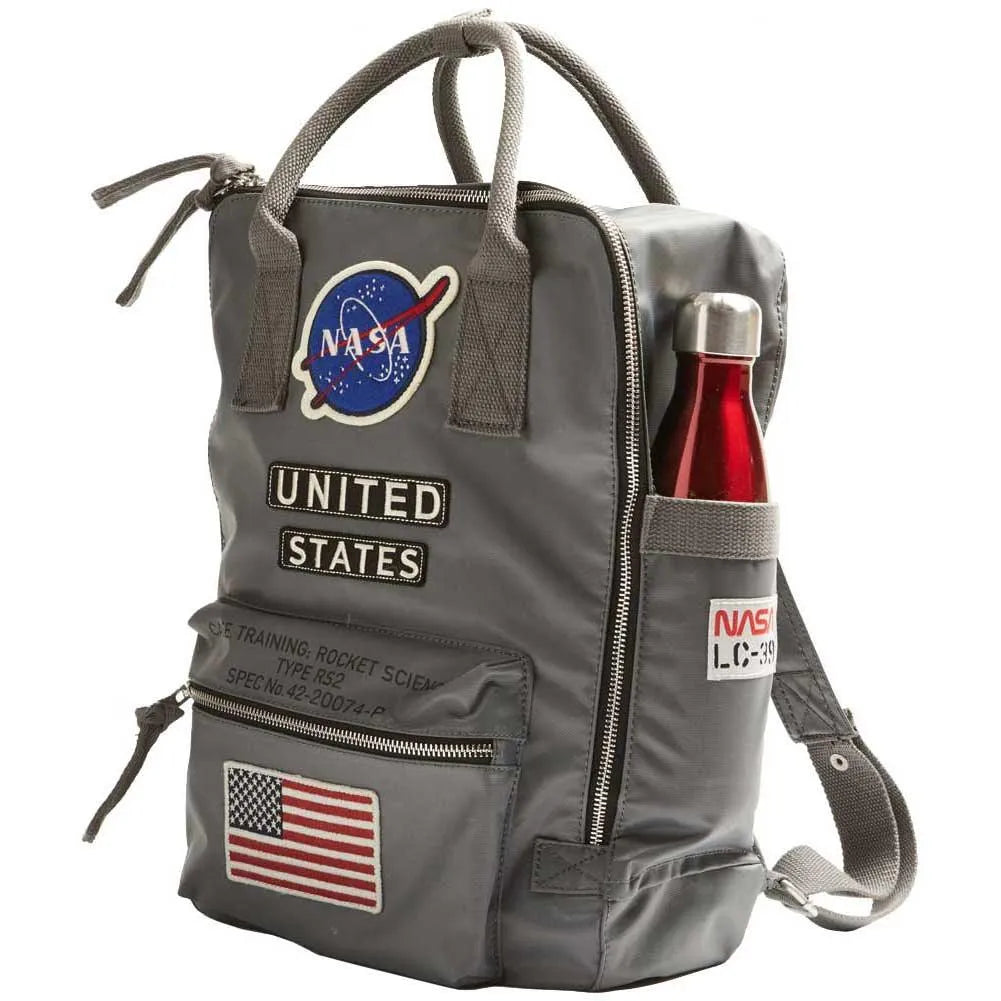 Whether or not you ever find yourself on a space shuttle, you can celebrate NASA’s great space explorers with the NASA Backpack. The rocket scientist NASA rucksack sports a nylon body with zippers, NASA patches, side pockets for water bottles or a small umbrella; plus a front pocket for maps, keys and a cell phone. Imported. Dimensions of the NASA school backpack: 15" H x 11" W x 5.5" D