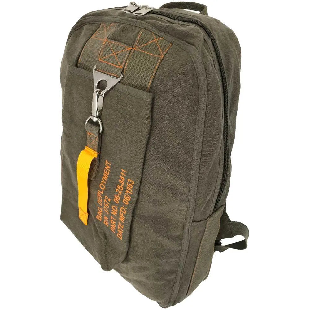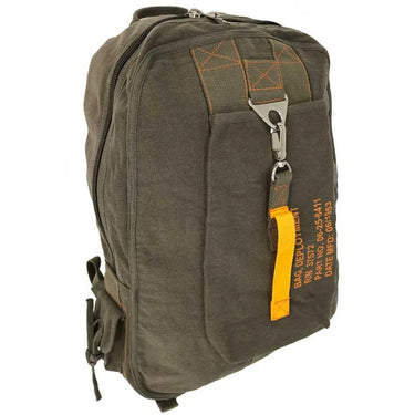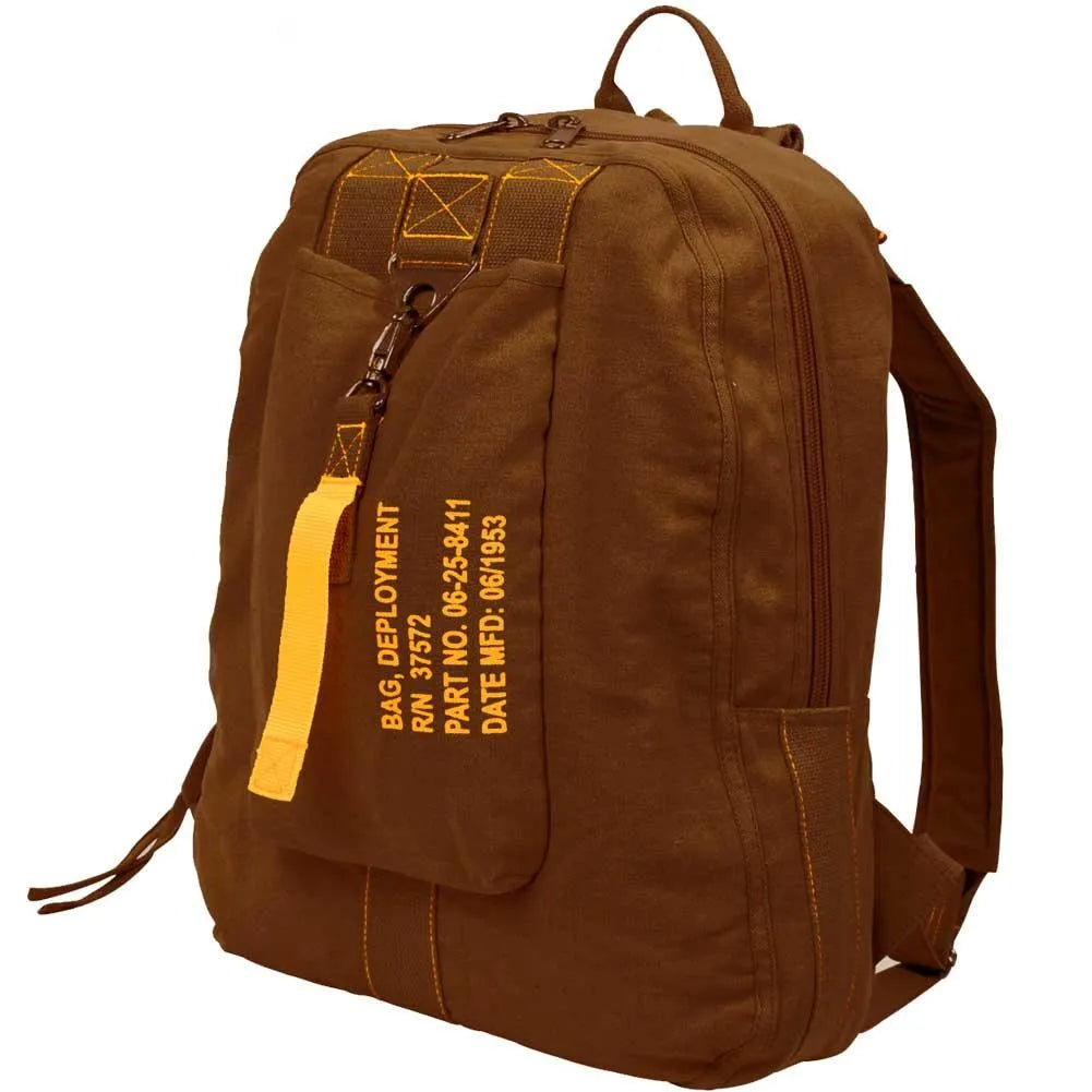 Black or Olive Vintage Canvas Military Flight Bag features a washed canvas material for that vintage look & feel. The Rothco backpack has an inner pocket, small side pocket with hook & loop closure and a front pocket with contrasting lettering reminiscent of a flight bag and metal clasp closure with pull tag. In addition, the bag features a top carry handle and padded shoulder straps. Dimensions: 15" W X 19" H X 4.5" D.