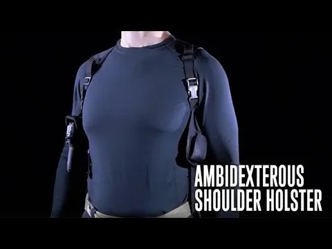 Rothco’s Ambidextrous Shoulder Holster is ideal for police and public safety professionals with a pistol holster opposite two magazine pouches.