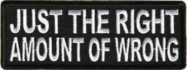 Patch features text, "JUST THE RIGHT AMOUNT OF WRONG". Great addition to your patch collection. Dimensions: 4" W X 1.5" H.