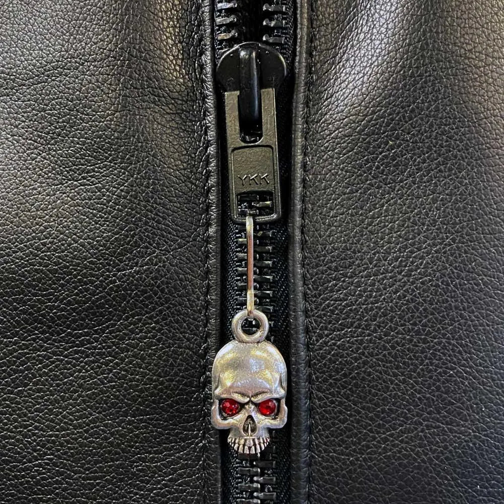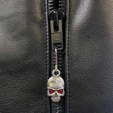 This metal skull zipper pull with red jewel eyes from Bravo Bells is the Cadillac of the wide range of options available on the market. The hand made red jeweled eyed skull zipper pull for jackets is a detailed work of art not found in any other brand. Lead-free cast pewter design features incredible relief of each pull in a variety of designs. Each novelty jacket zipper pull replacement comes with a 1-inch lanyard hook and a display card. Dimensions: approx. .75" W X 1.25" H.