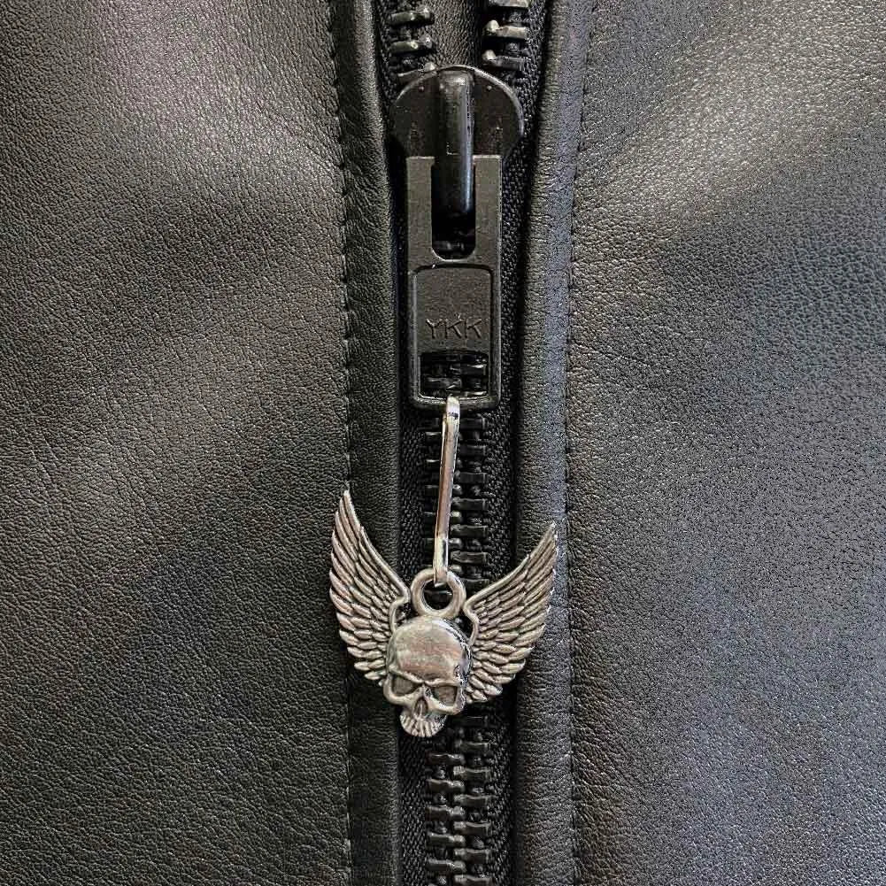 This metal skull zipper pull from Bravo Bells is the Cadillac of the wide range of options available on the market. The hand made upwinged skull zipper pull for jackets is a detailed work of art not found in any other brand. Lead-free cast pewter design features incredible relief of each pull in a variety of designs. Each novelty jacket zipper pull replacement comes with a 1-inch lanyard hook and a display card. Dimensions: approx. 2" W X 1" H.