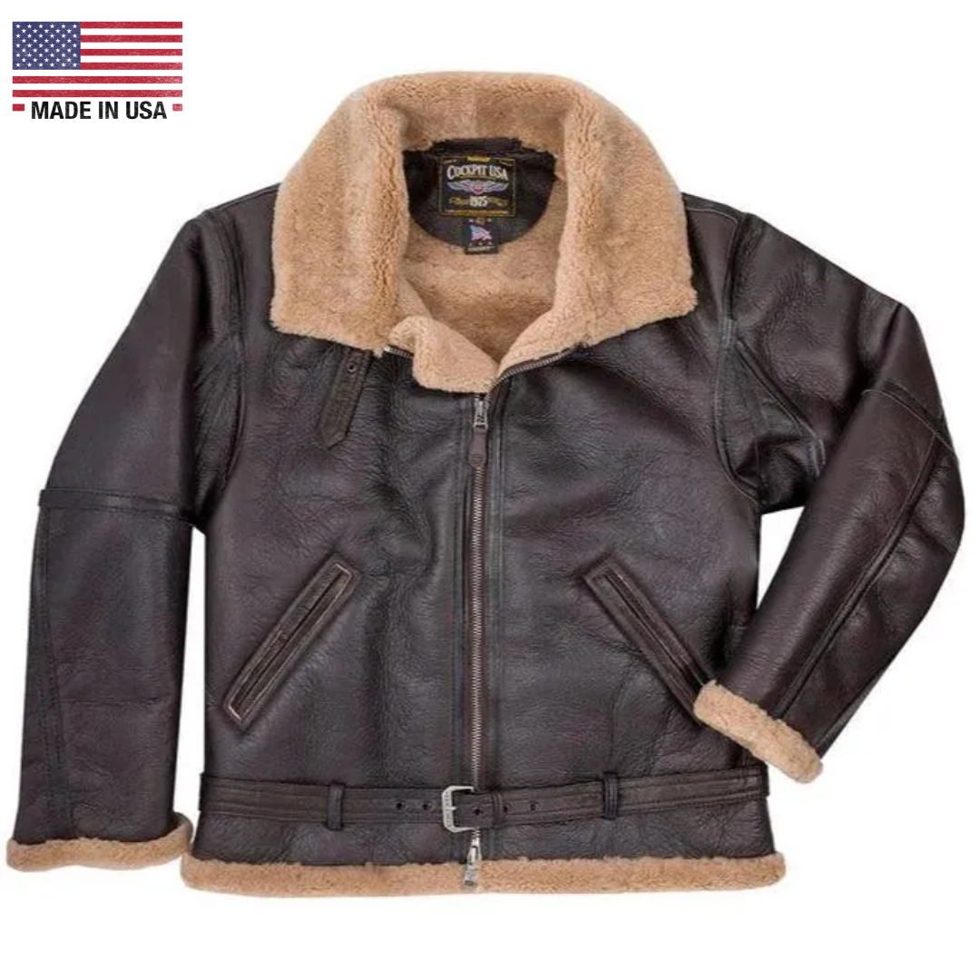 Originally built for open-cockpit RAF fighter pilots in 1937, this sheepskin bomber jacket carries the heritage of the Spitfire and Hurricane—now refined for everyday wear. Cockpit USA’s updated RAF Sheepskin Jacket uses short-sheared shearling to reduce bulk and increase mobility, giving you the warmth and authenticity of the original with a lighter, more versatile fit.