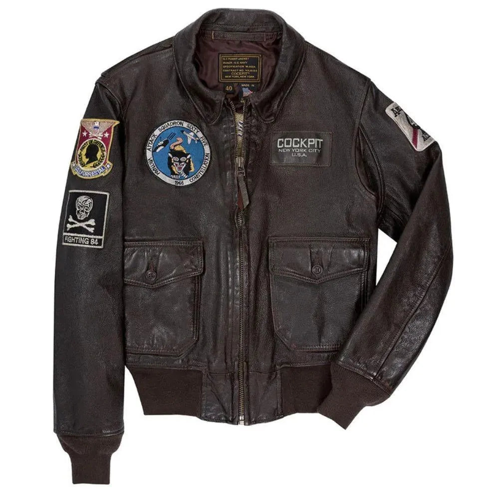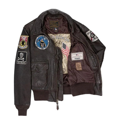 Cockpit USA’s USS Forrestal Navy fighter pilot G-1’s hand treated vintage goatskin has authentic replicas of a USS Forrestal Vietnam fighter pilot’s jacket patches. It also features a beautiful hand silk screen printed U.S.S Forrestal aircraft carrier on the back and the famed Tonkin Gulf Yacht Club patch signifying service off the coast of North Vietnam. Fur collar removed for warmer weather comfort. All in all, a must have historical jacket. If you would like this jacket without patches, please see our original naval aviator jacket. Please note that each USS Forrestal Vietnam Pilot Jacket is unique and its distress vegetable tanning may vary from production to production.