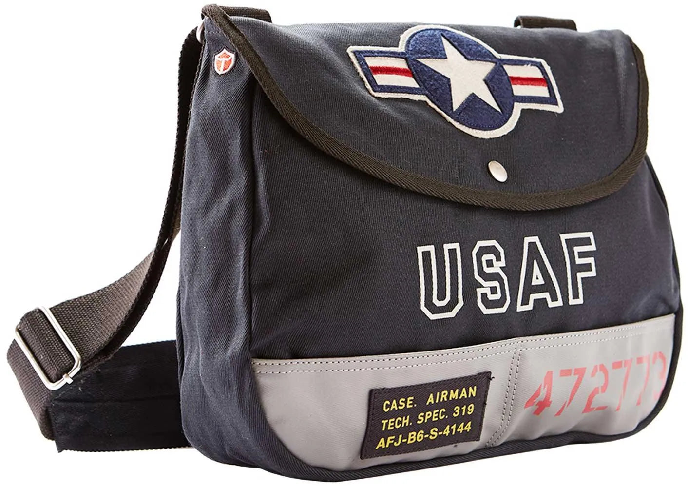 This USAF navy blue shoulder bag with a snap flap features historic US Air Force emblems that have been seen on military aircraft since the 1940s. Perfect for carrying a quick change of clothes, maps and your wallet, keys and phone. 100% dark navy blue cotton twill, two decorated grey pouches on front with Velcro closure for small items, US Air Force aviation roundel logo patch, USAF spec patch, adjustable two snap flap cover, one inside cell phone pocket and adjustable shoulder strap. Dimensions: 14.5" L x 3.5" H x 11.5" W.