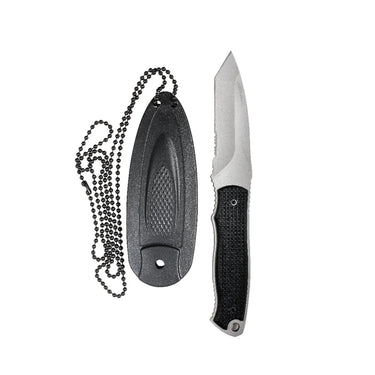Rothco's Neck Knife With Sheath features a partially serrated blade with bead blast finish, ABS plastic sheath with chain.