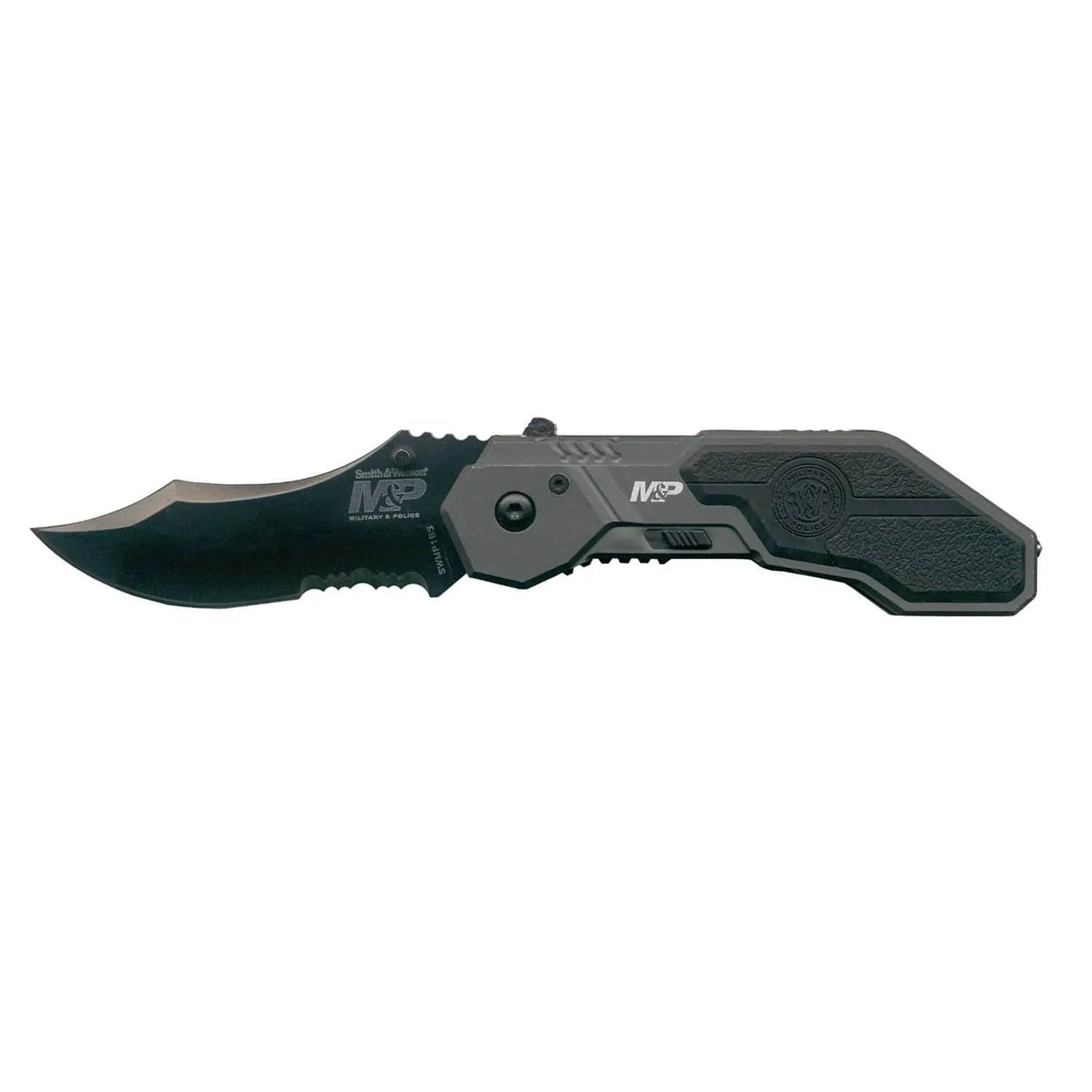 The Smith & Wesson Assisted Opening Military & Police Knife features a side safety M.A.G.I.C. assisted opening system that allows single-handed operation. Designed for military and law enforcement use, it's durable in the extreme, with an aluminum handle with rubber inserts and a titanium-coated stainless steel, half-serrated blade.