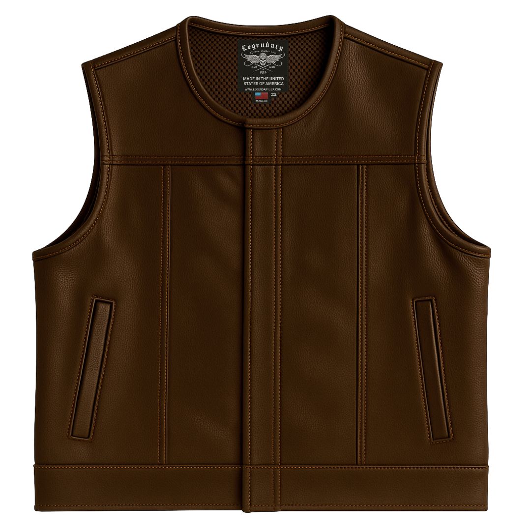 Legendary LowLife NCP Cropped Fitted Leather Club Style Motorcycle Vest in Rich Dark Chocolate is built with a rugged 1.4mm naked cowhide leather for added durability. This vest is 3" inches shorter than the standard Legendary USA vest, offering a more cropped fit for comfort while riding. This is a traditional club vest, with a collarless design, this Dark Chocolate leather naked cowhide vest has a one-piece back panel, leather-bound armholes, No Chest Pockets, and a hidden snap down front with a cropped brass YKK zipper. Perfect for concealed carry, it comes with two secure gun pockets with quick-release snap closures. The cropped design and premium features make it ideal for riders who want style and practicality.