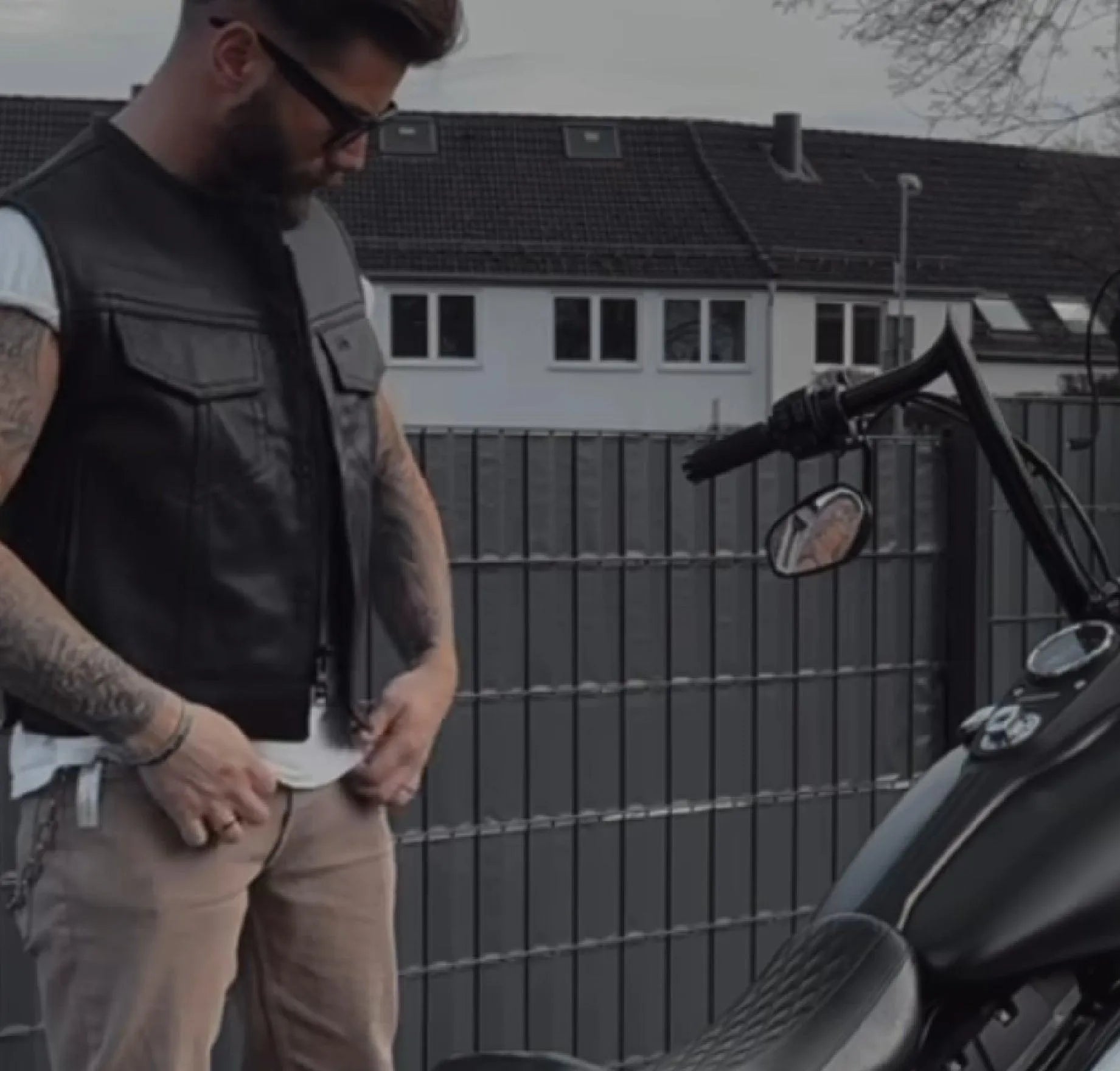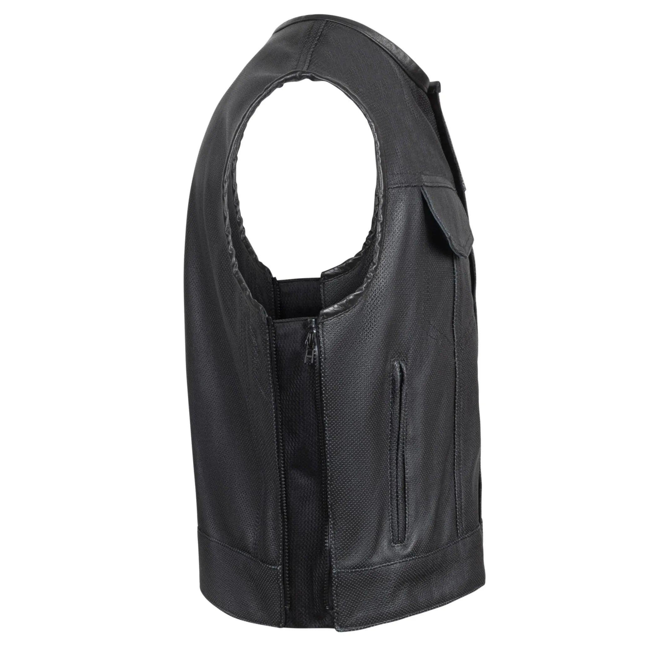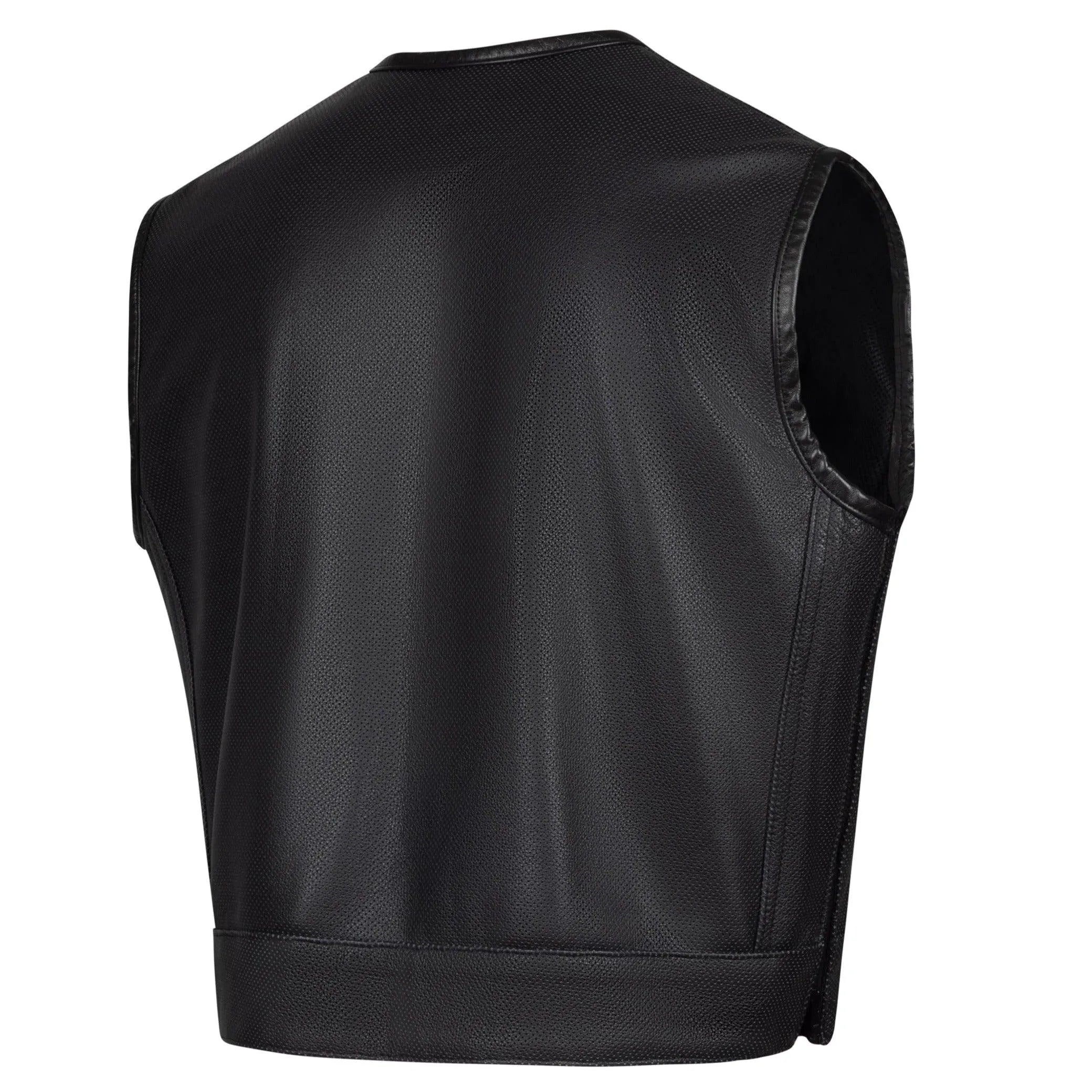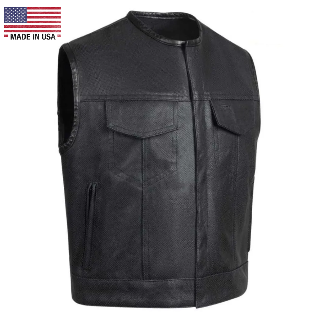 Check out the Legendary ‘Holy Trinity’ Cropped Perforated Leather Motorcycle Vest, made with Ricky Snakez for the hottest days. This vest has a cool 2-inch cropped waist and no collar. The special double zipper lets you open the bottom for extra airflow to keep you cool. The perforated leather helps you stay comfortable by letting in more air. It also has two snap pockets for carrying a full-size Colt .45, and handy pockets with scratch-proof zippers for your stuff. Plus, it has extra pouches for your phone and other small items, keeping your gear safe and easy to access. This vest is great for looking cool and staying comfortable. Our Cropped Perforated Leather Motorcycle Vest is a Best Seller.
