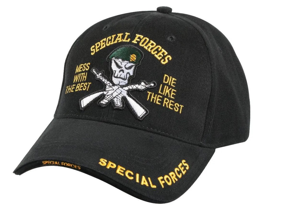 Rothco’s Deluxe Low Profile Special Forces Insignia Cap features a stylish raised embroidered design and a sandwich brim.  This cap is made from a durable 100% brushed cotton twill, and features a raised 3-D embroidered special forces insignia along with the text, “Mess With The Best, Die Like The Rest” printed on the front panels. This military hat also features the text “Special Forces” embroidered on the front panel and sandwiched brim, with an adjustable hook and loop closure in the back.