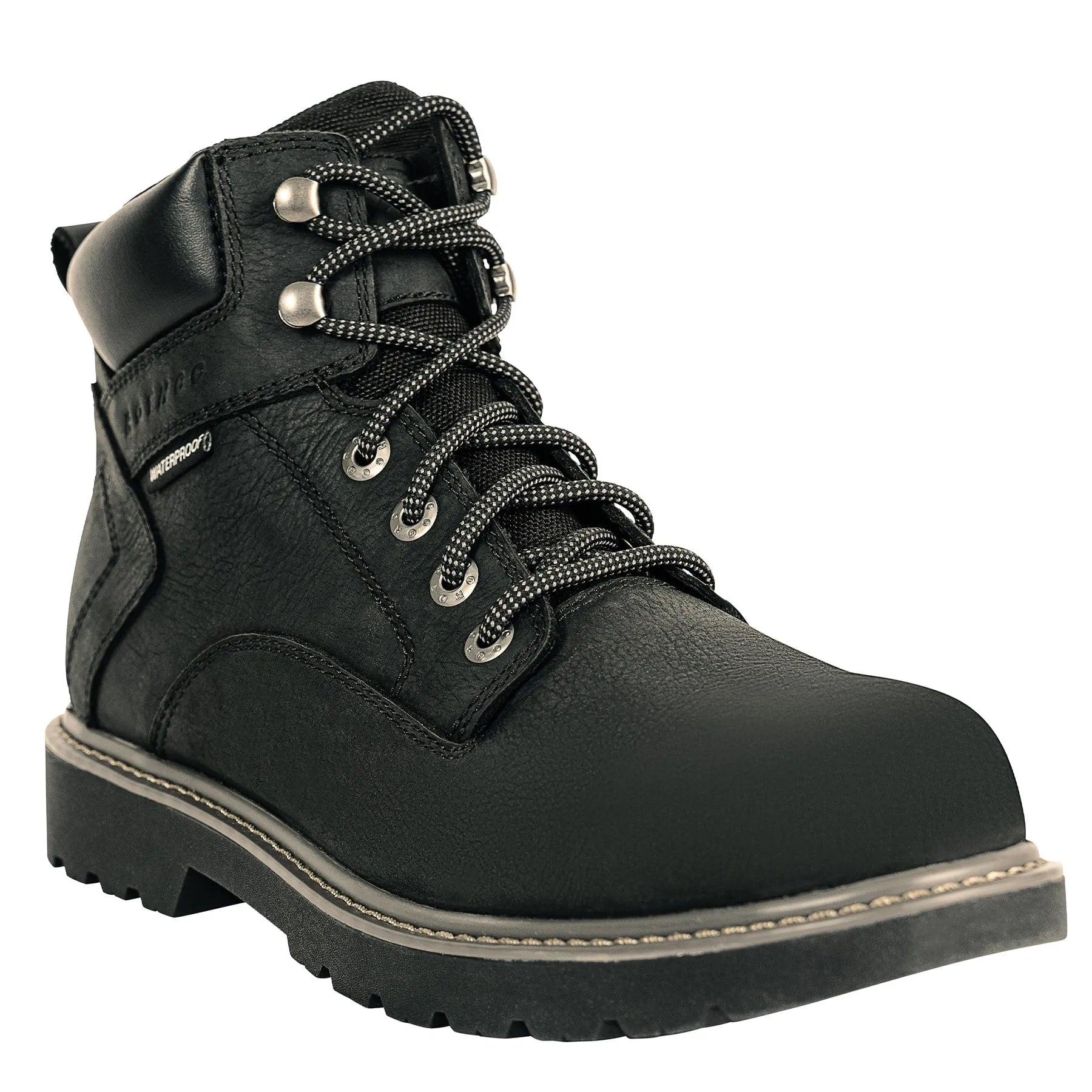- H2O Lock Weather Protection System: Featuring a premium waterproof leather and polyester upper, these work boots ensure your feet stay dry, no matter the environment. The comp toe boot utilizes a waterproof internal lining for added protection, with a moisture wicking mesh liner underneath for breathability while keeping water out. The gusseted tongue helps shield your foot from dirt and debris.