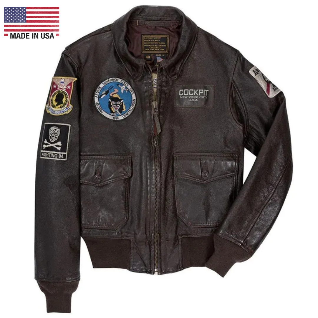 This faithfully reproduced G-1 includes Vietnam-era patches, the famous Tonkin Gulf Yacht Club insignia, and a hand-blocked sketch of the Forrestal CVA-59 across the bi-swing back. With 1950s-style flap pockets, knit trim, interior storage, and a lightweight lining with patriotic appliqué, this jacket blends museum-level authenticity with everyday wearability. For a cleaner look without patches, Cockpit USA also offers the original Naval Aviator Jacket.