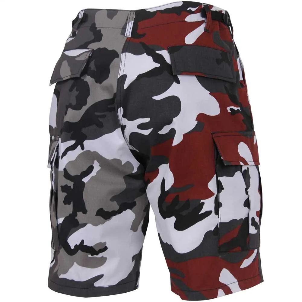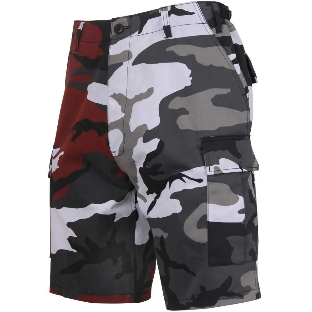 These exclusive two-tone shorts for men combine two camouflage patterns on one short, with each leg a different color! These military style Battle Dress Uniform Color Camouflage Shorts come in 4 fashion color combinations and are made with comfortable, durable poly/cotton twill for long lasting wear. The Rothco BDU cargo shorts include 6 utility pockets (2 button down back pockets, 2 front slash pockets and 2 cargo pockets). Additional features of these men's multicolored camouflage shorts include an adjustable waist tabs for a secure fit and button fly. Imported.