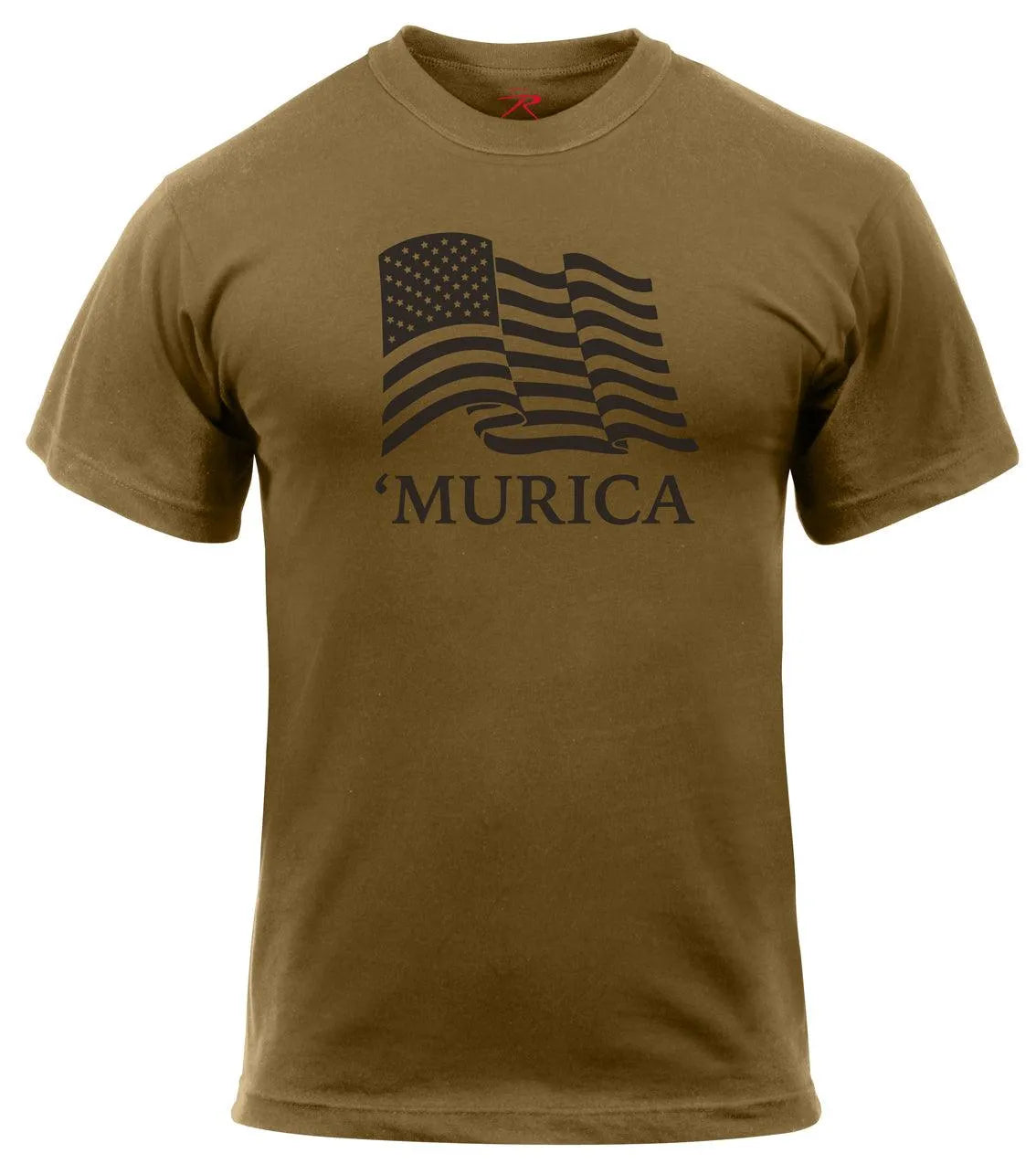 Rothco's Athletic Fit T-Shirt is designed with an insert collar, and a slightly smaller chest, armhole, and sleeve opening. The American flag shirt features a black American flag and ‘MURICA lettering on the front of the shirt. This patriotic shirt is made with a soft and durable 60% cotton and 40% polyester material.