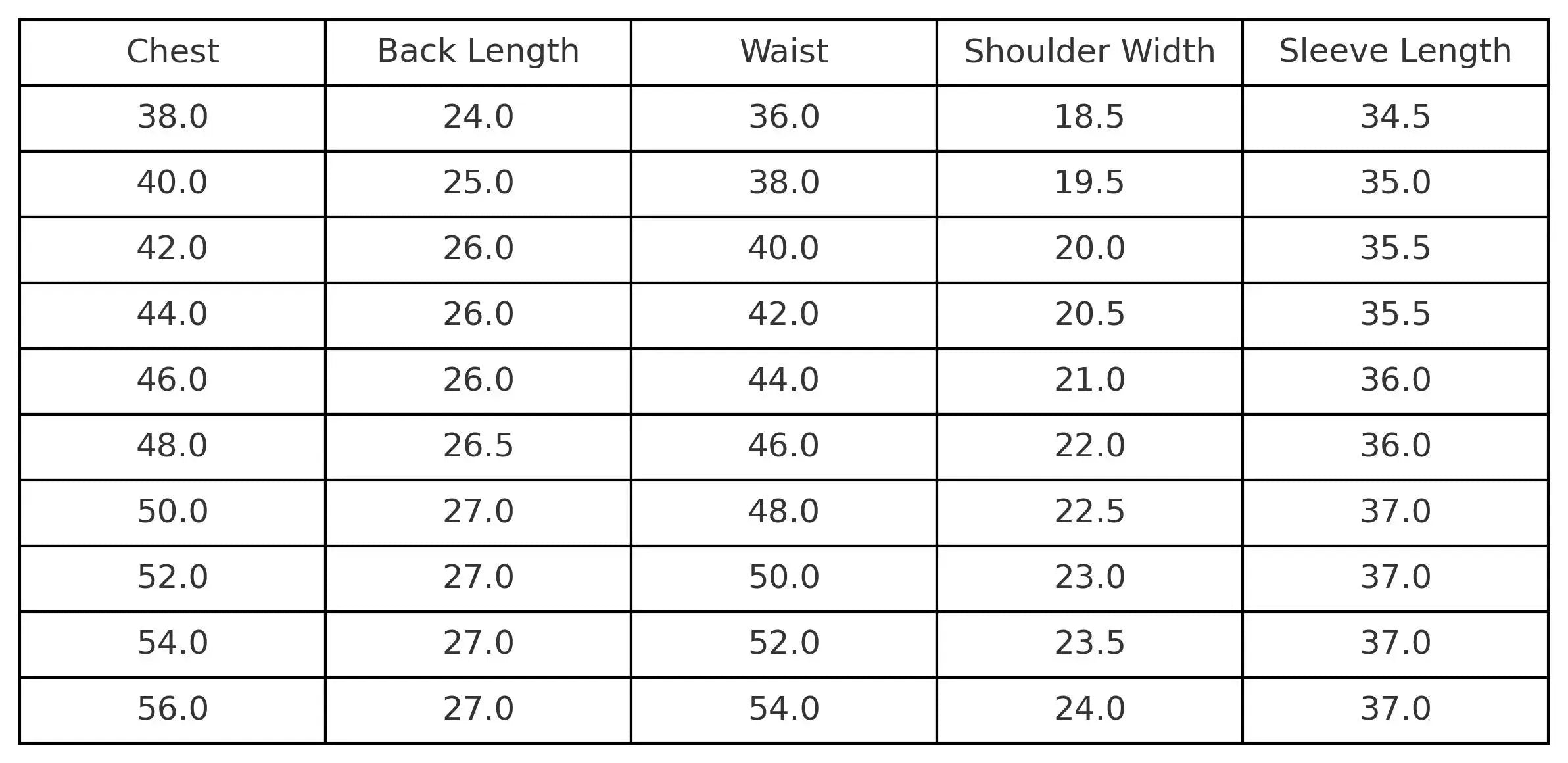 Chest Back Length Waist Shoulder Width Sleeve Length