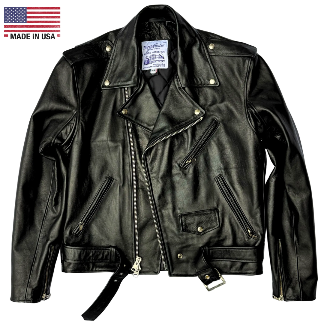 The BECK® 999 is back, reimagining the iconic motorcycle jacket for a new generation of riders. Crafted from genuine front quarter horsehide drum-dyed black midweight horsehide, this jacket honors its roots while showcasing modern craftsmanship. Each piece is proudly MADE IN THE USA, delivering unmatched quality and rugged durability. This black horsehide leather jacket is built to last a lifetime, aging gracefully as it molds to its owner and develops character over the years. The BECK® 999 balances vintage appeal with contemporary style and functionality.