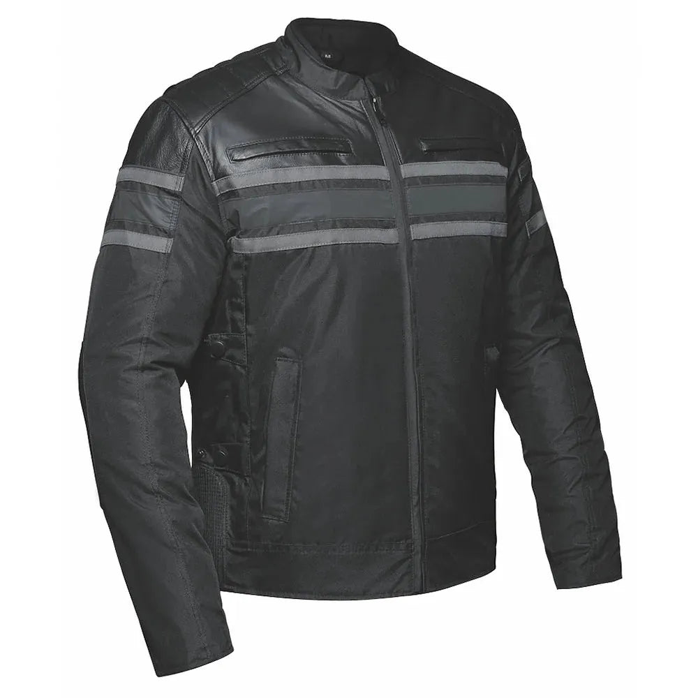 Vortex - Mens Ultra Leather Motorcycle Jacket by UNIK Leather Co. is a sophisticated men's leather/nylon hybrid jacket that blends functionality with modern style. Crafted from a combination of textile and cowhide leather, this jacket is designed to offer durability and comfort in various environments. It features removable armor in the back, elbows, and shoulders for enhanced protection, making it ideal for motorcycle riders and outdoor enthusiasts. Reflective piping and stripe accents not only add a stylish touch but also improve visibility in low-light conditions. With four exterior pockets and two concealed carry interior pockets, it provides ample storage options for essentials.