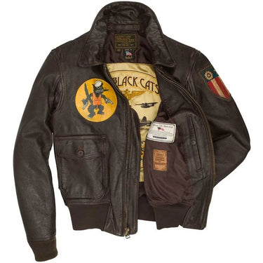 Inspired by the courageous night crews of the PBY Catalina “Black Eagle,” the Cockpit USA WWII South Pacific Pilots Jacket honors the stealth squadrons known as the Black Cats—aviators who flew low, dark, and dangerous missions across the Pacific. This hand-finished goatskin jacket captures the exact look of the modified WWII originals, complete with historically accurate patches, nose art, and a distress-tanned leather finish that makes each jacket unique. Built with classic naval flight details and a vintage silhouette, it delivers a powerful tribute to America’s unsung WWII aviators.