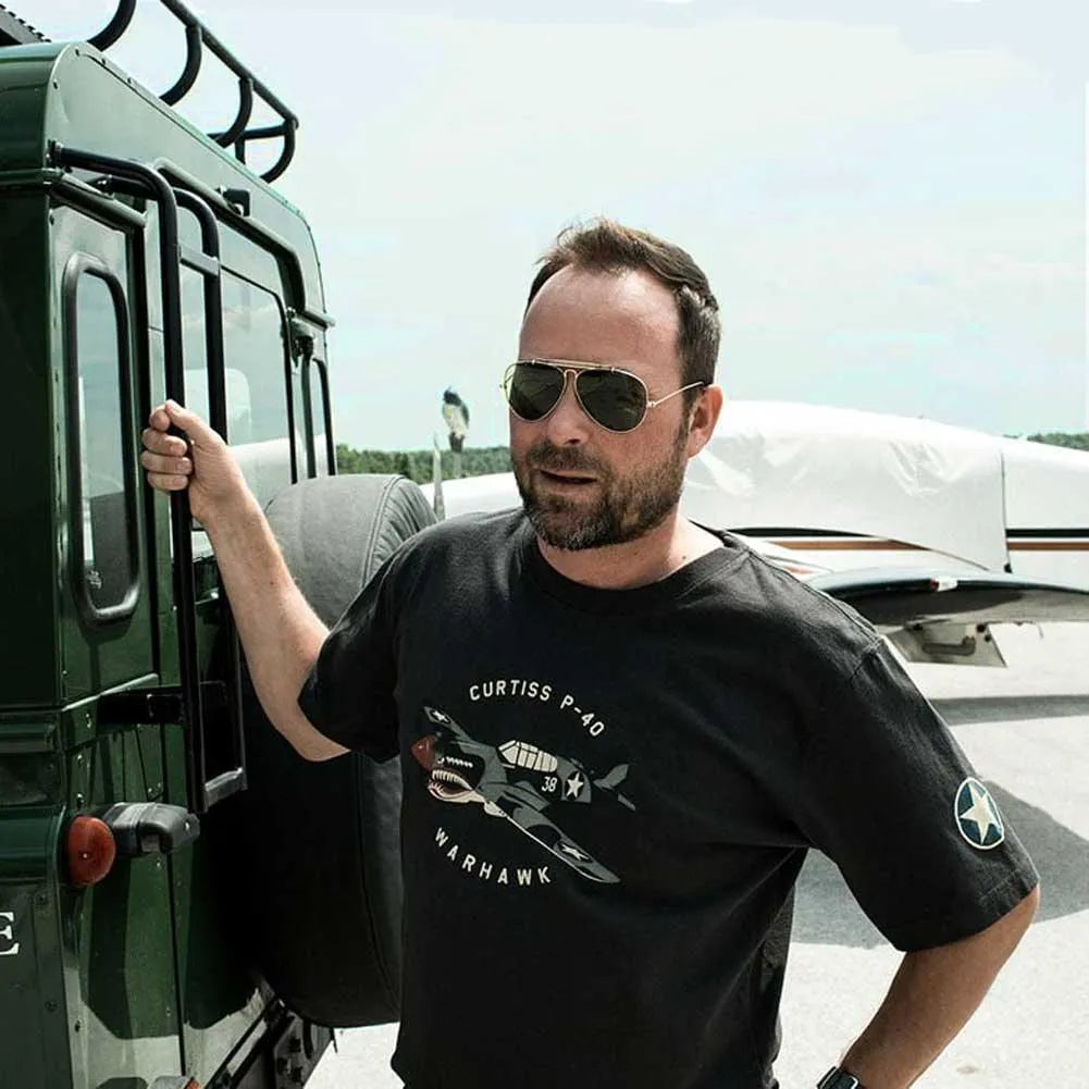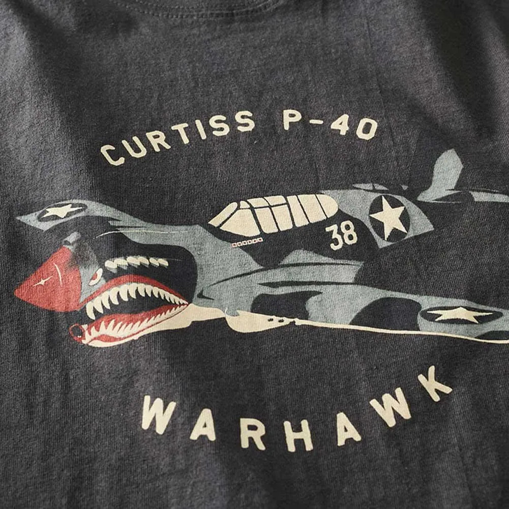 • Curtis P40 Warhawk text and camouflaged Tiger plane on chest
