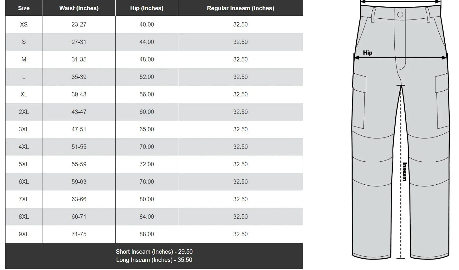 How to Measure: Measure horizontally from end to end where the belt loops are located for the waist. For the hip width, measure horizontally from cargo side pocket to cargo side pocket. The inseam length can be found by measuring from the crotch down the end of the BDU Pants. Use the chart to find your measurement.