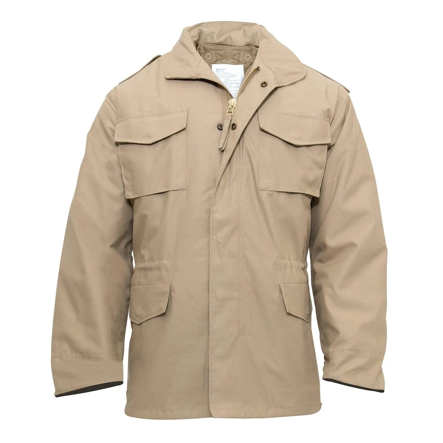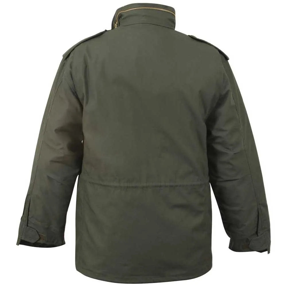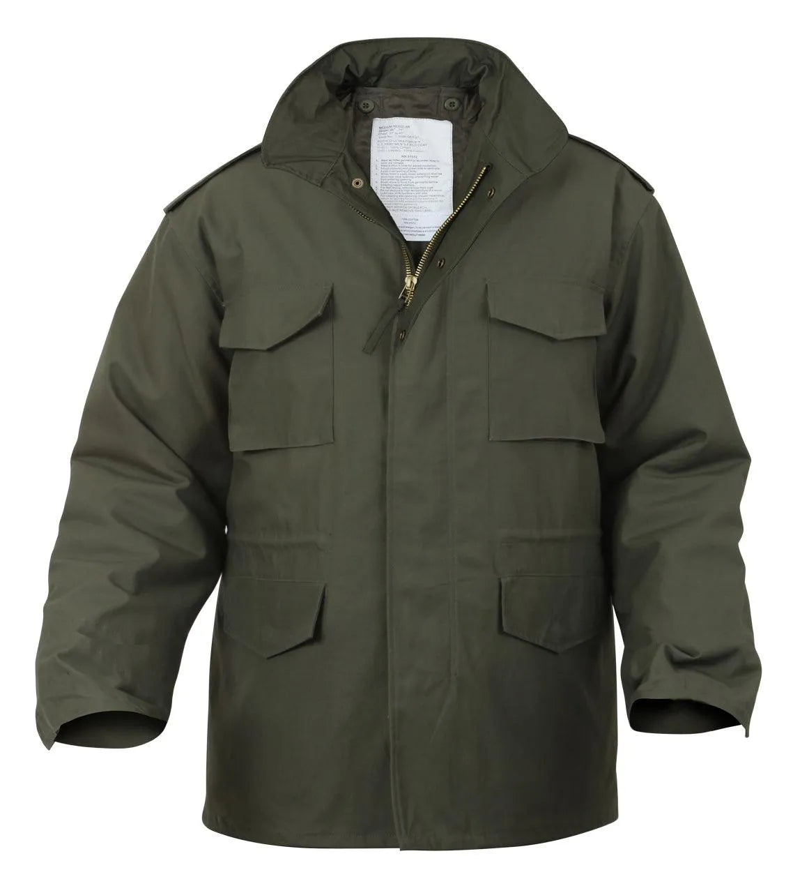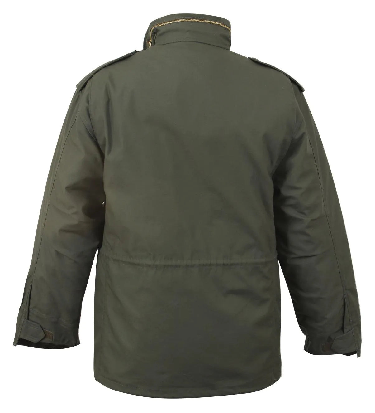 The Rothco M65 field jacket is a classic piece of military outerwear. The jacket features a water repellent poly/cotton twill, four snap-up pockets, concealed hood, epaulets, waist hood and bottom drawstrings, removable button-in liner, hook & loop fastener sleeve cuffs and heavy brass zipper & snap up storm flaps. This green field jacket offers versatility that allows you to wear it through multiple seasons.