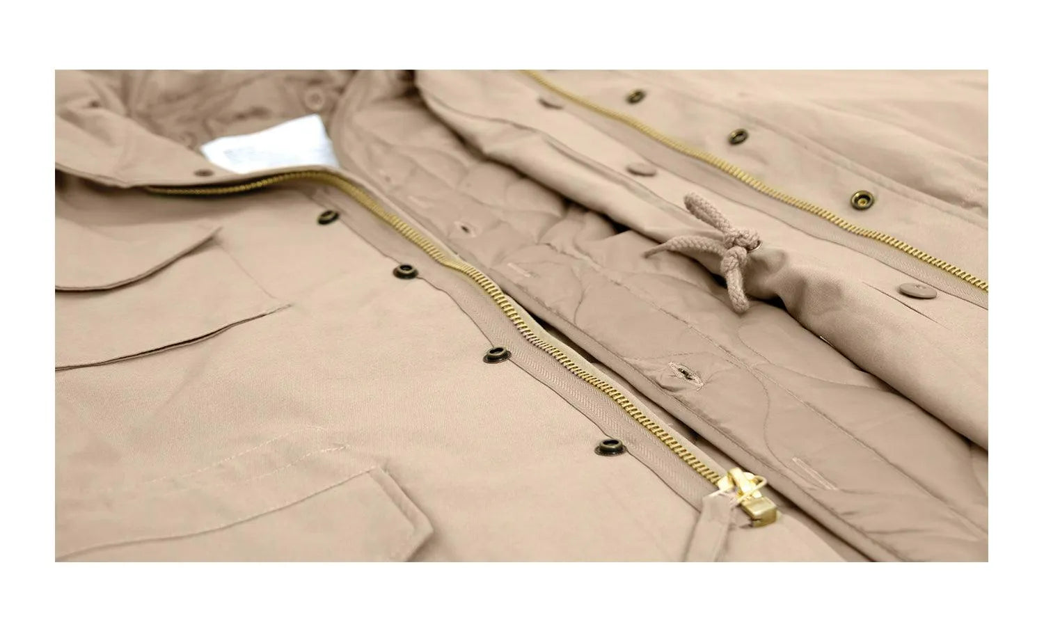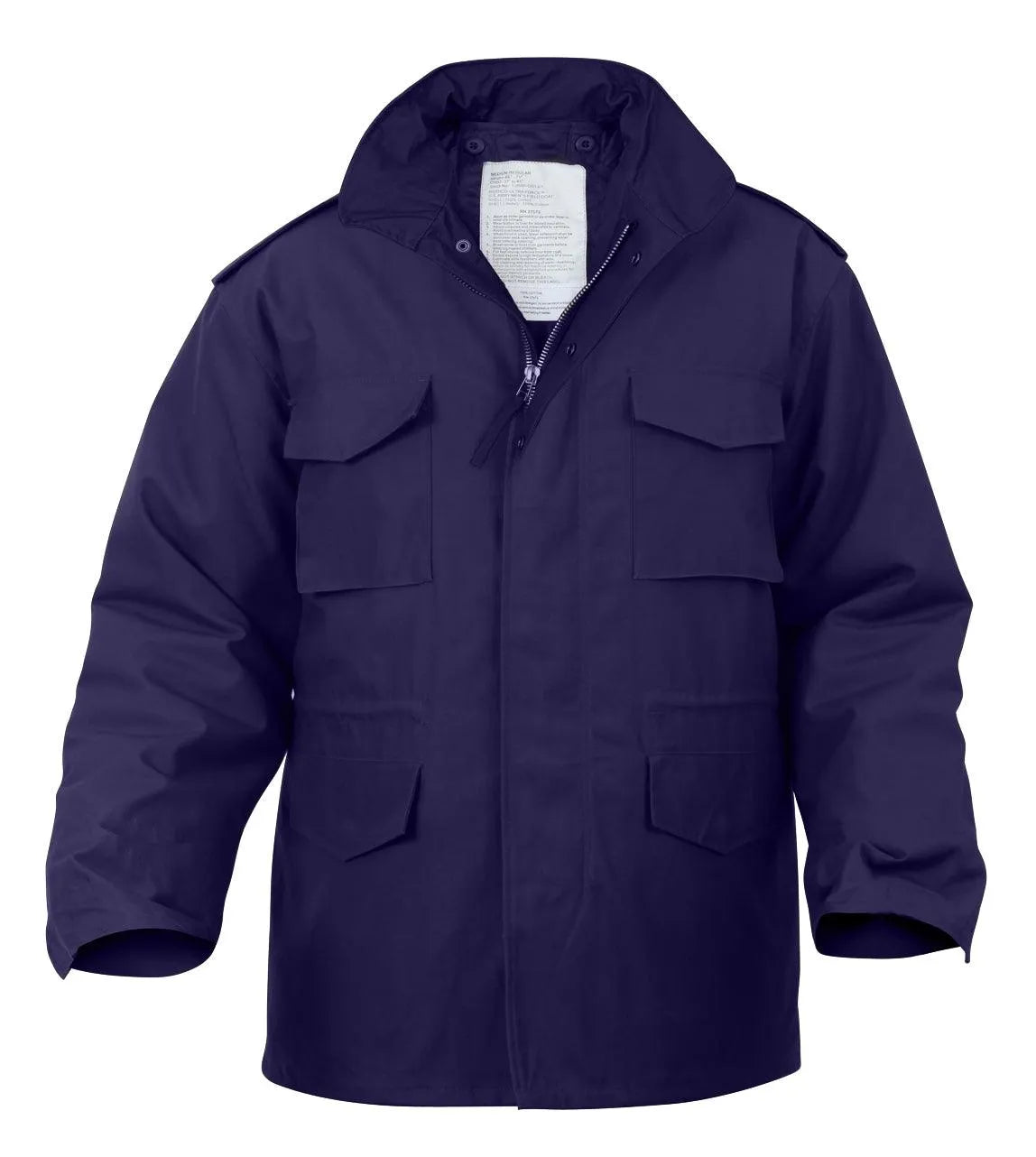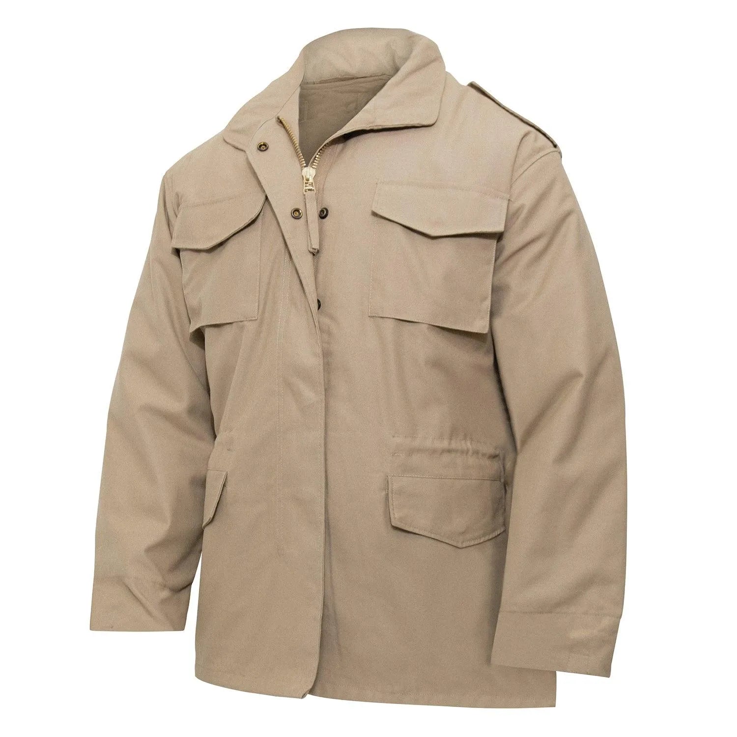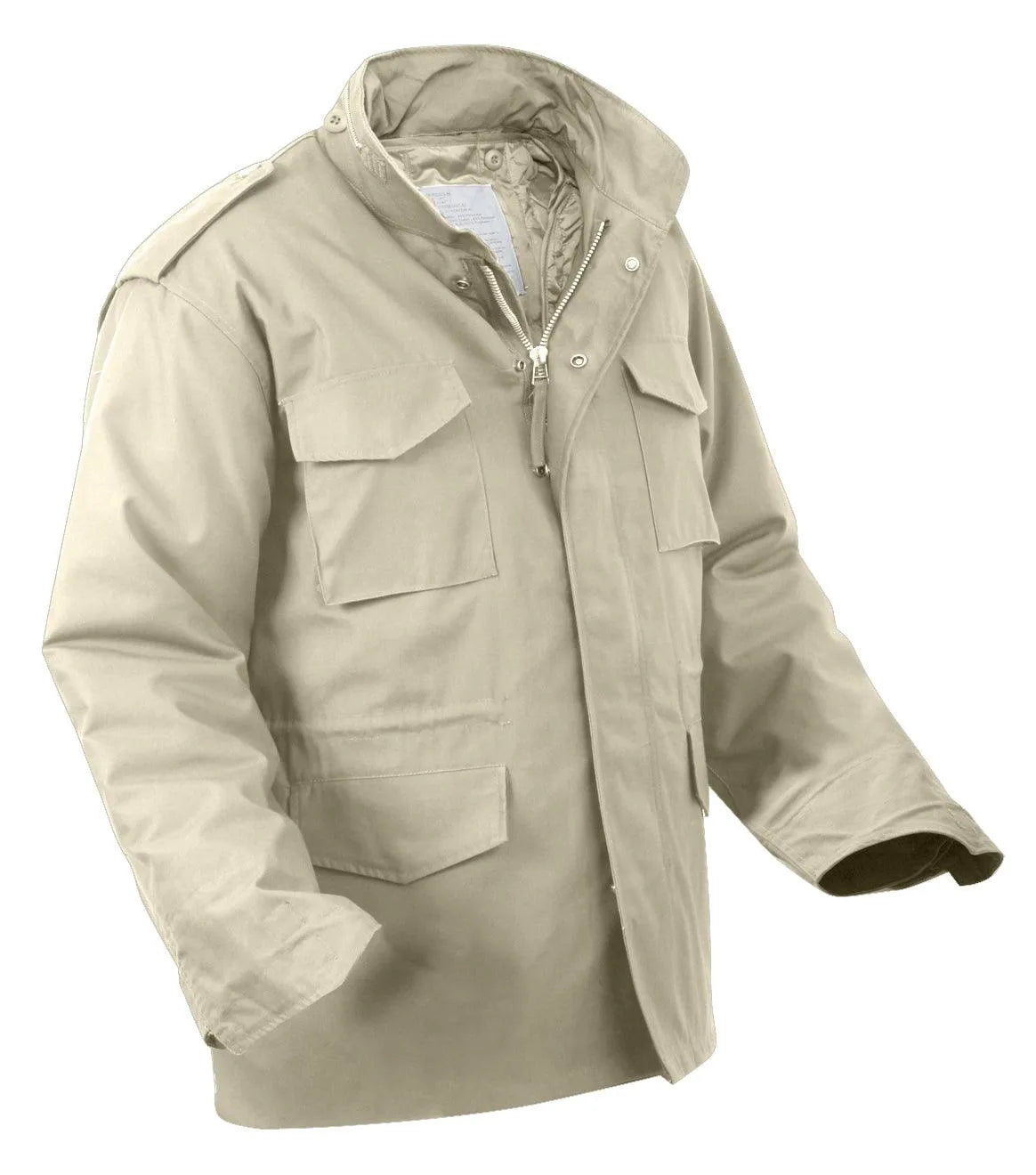 The Rothco M65 field jacket is a classic piece of military outerwear. The jacket features a water repellent poly/cotton twill, four snap-up pockets, concealed hood, epaulets, waist hood and bottom drawstrings, removable button-in liner, hook & loop fastener sleeve cuffs and heavy brass zipper & snap up storm flaps. This green field jacket offers versatility that allows you to wear it through multiple seasons.