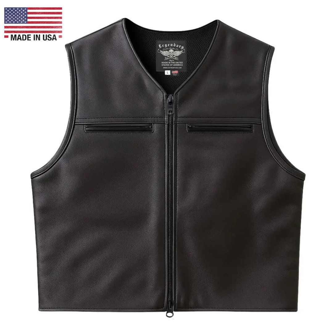 Looking for a V-neck motorcycle vest made in the USA? Legendary USA produces premium leather riding vests built with traditional American craftsmanship and timeless biker style. Known for their clean front profile and classic fit, V-neck leather motorcycle vests remain one of the most recognizable pieces of motorcycle gear. Built for durability, comfort, and everyday riding, these American made motorcycle vests offer a straightforward design that works just as well on long rides as it does off the bike.