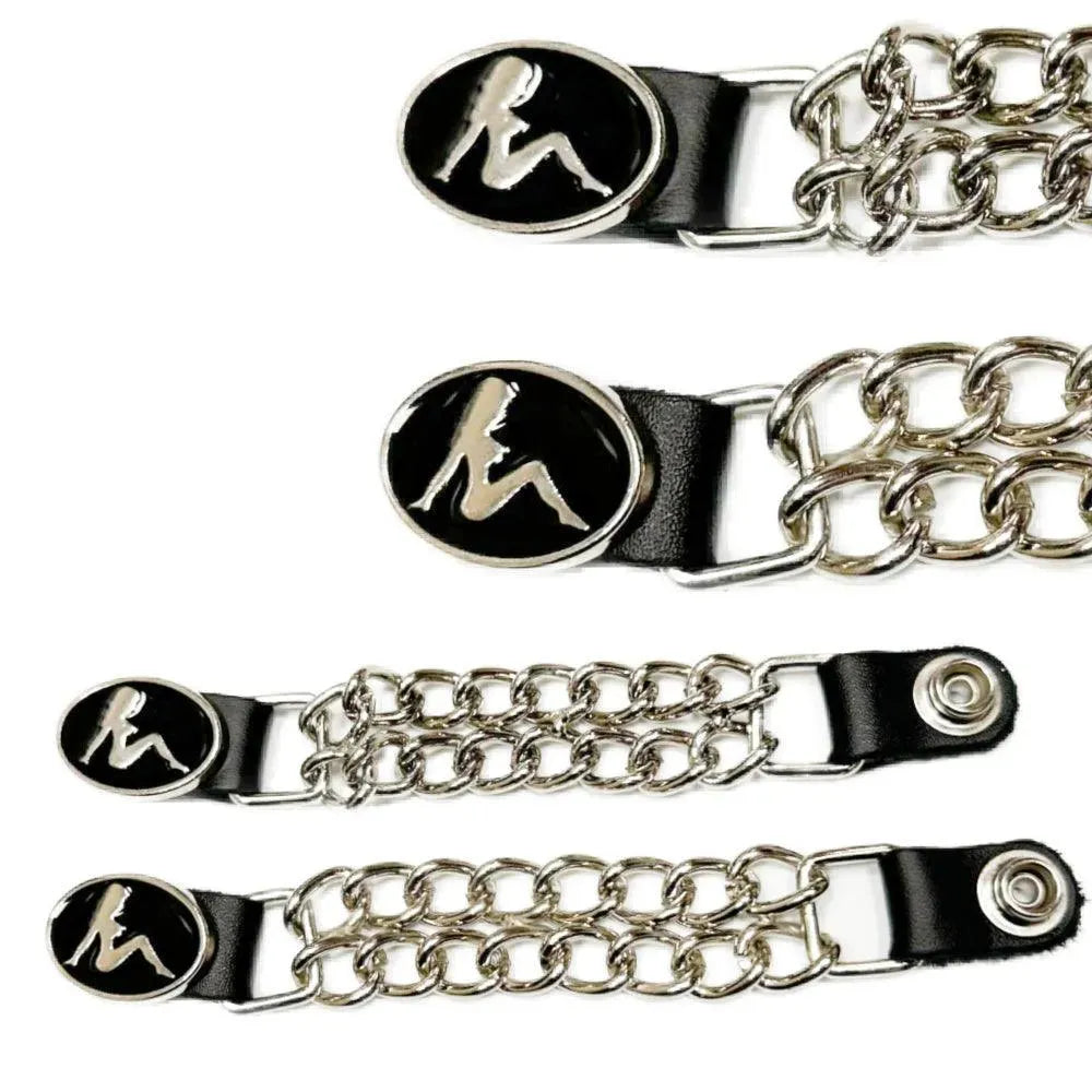 Timeless Sexy Trucker Mud Flap Girl vest extenders are an instant classic and also a best seller. These are first class premium vest extenders. Full grain cowhide leather and they are Hand Made in USA.Widen the range of your vest with our leather vest extenders. These biker vest chains extend the size of your leather vest by 5", which helps in wearing your vest over leather motorcycle jackets, or just for additional ventilation during warm days. 5" chain vest extenders with Sexy Trucker Mud Flap Girl Medallion as snap covers. Fits all vests. Sold in pairs. Absolutely the best vest extenders you've ever owned.