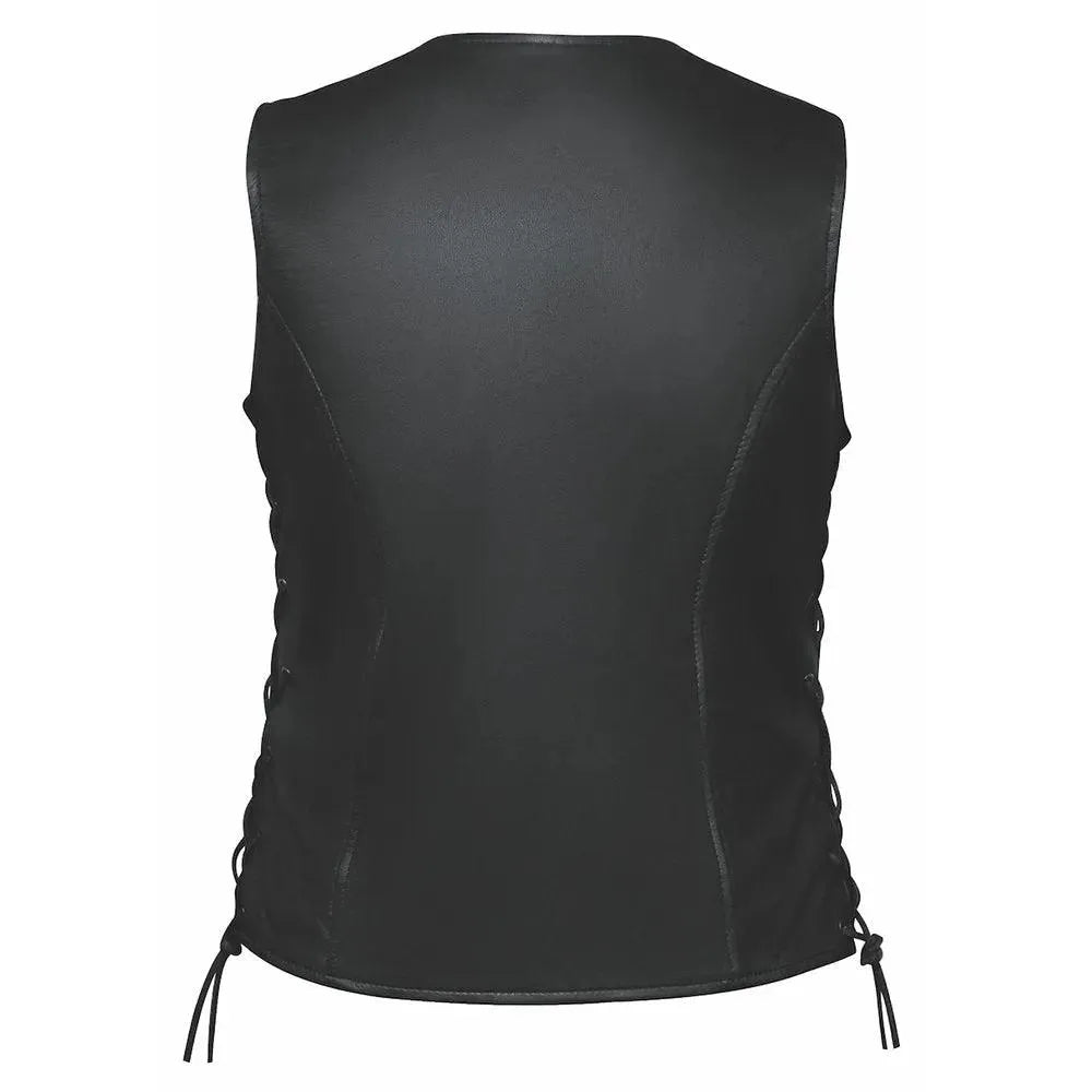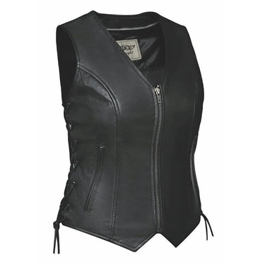 Mae - Womens Zippered Leather Motorcycle Vest by Unik combines cowhide leather construction, two exterior zippered pockets, two interior concealed carry pockets, antique brass hardware, side laces for fit adjustment, and a front zipper closure. Available in sizes XS to 5XL, this vest offers both style and practicality for various occasions.