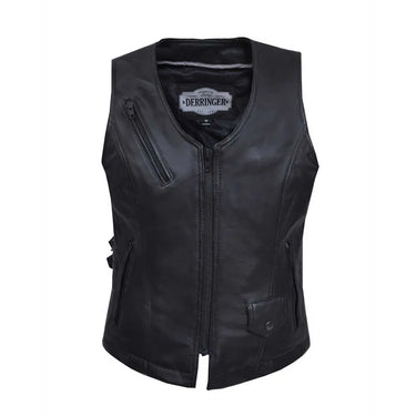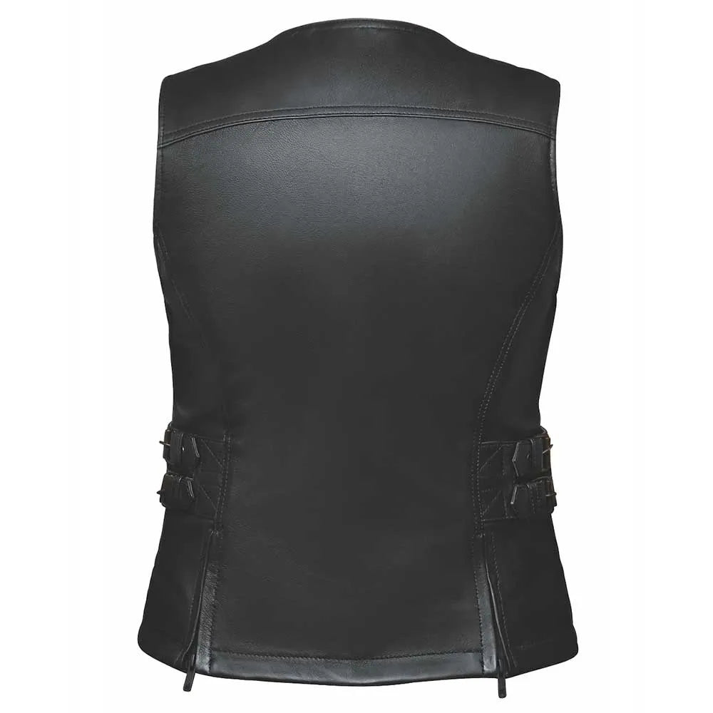 Midnight Cowgirl - Ladies Premium Leather Vest, embodies timeless elegance and practicality with a ladies' premium zippered vest crafted from lightweight lambskin leather. Its classic design, featuring black hardware and a front zipper closure, makes it a versatile and sophisticated addition to any wardrobe. It offers premium quality and style for women who appreciate refined craftsmanship. Made from luxurious lambskin leather in a sleek black color, it includes: