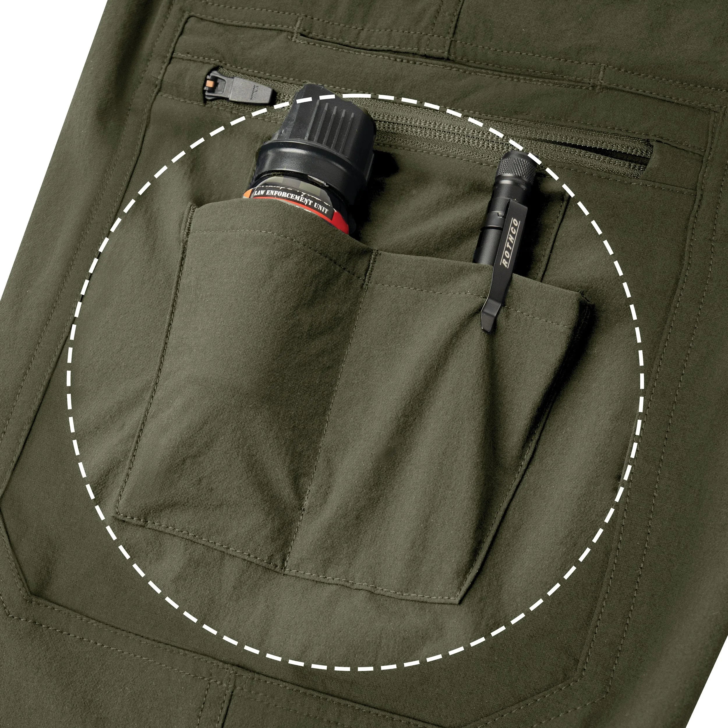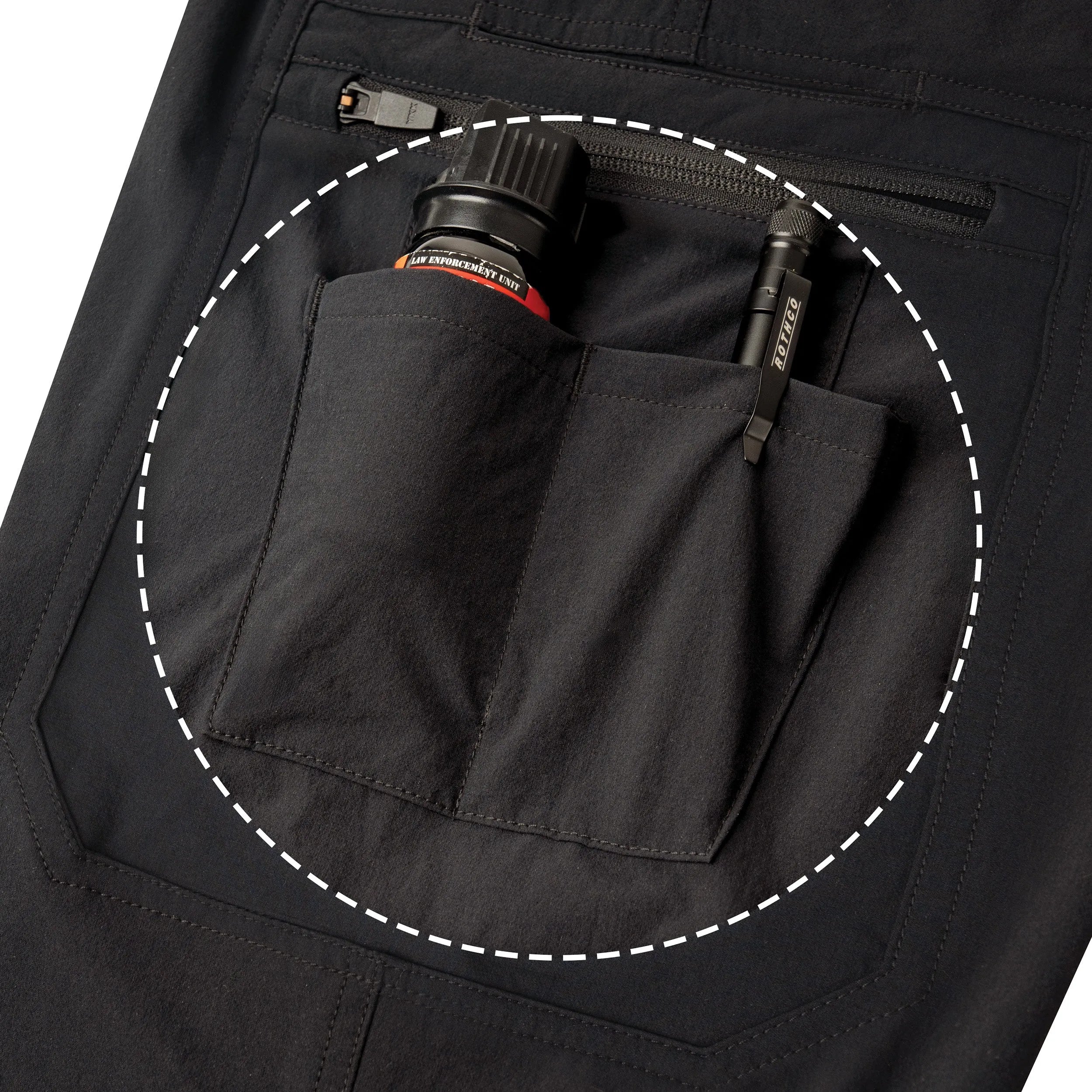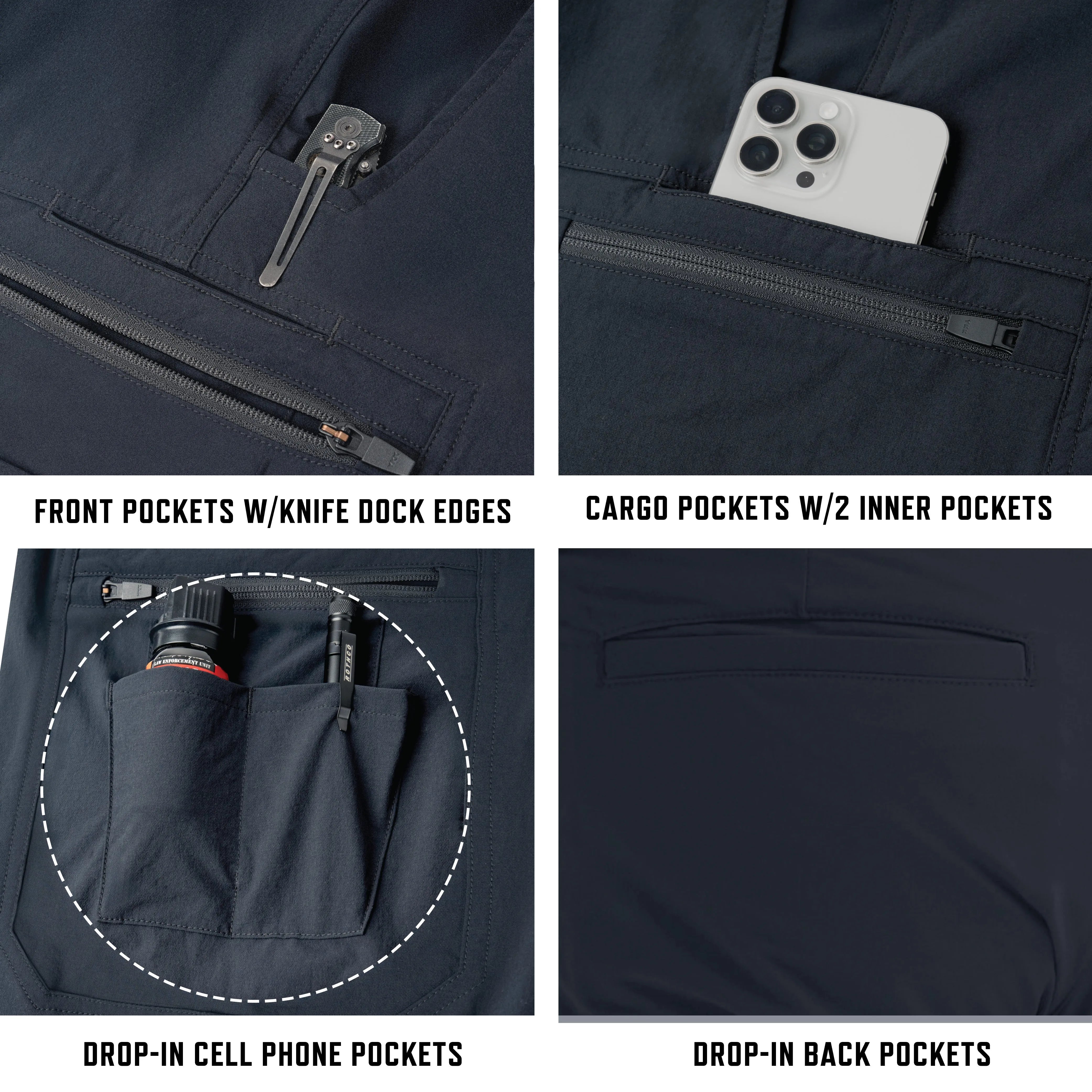 - Task-Ready Pockets: The plainclothes duty pants come equipped with our T.R.P. System that incorporates dual zippered low-profile cargo pockets with 2 inner firearm mag pockets, dual drop-in cell phone pockets, dual vertical “L” style front pockets with reinforced knife dock edges, and dual drop-in back pockets for duty gear, tactical equipment, and EDC essentials.