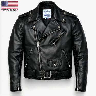 The BECK® 999 is back, reimagining the iconic motorcycle jacket for a new generation of riders. Crafted from genuine front quarter horsehide drum-dyed black midweight horsehide, this jacket honors its roots while showcasing modern craftsmanship. Each piece is proudly MADE IN THE USA, delivering unmatched quality and rugged durability. This black horsehide leather jacket is built to last a lifetime, aging gracefully as it molds to its owner and develops character over the years. The BECK® 999 balances vintage appeal with contemporary style and functionality.