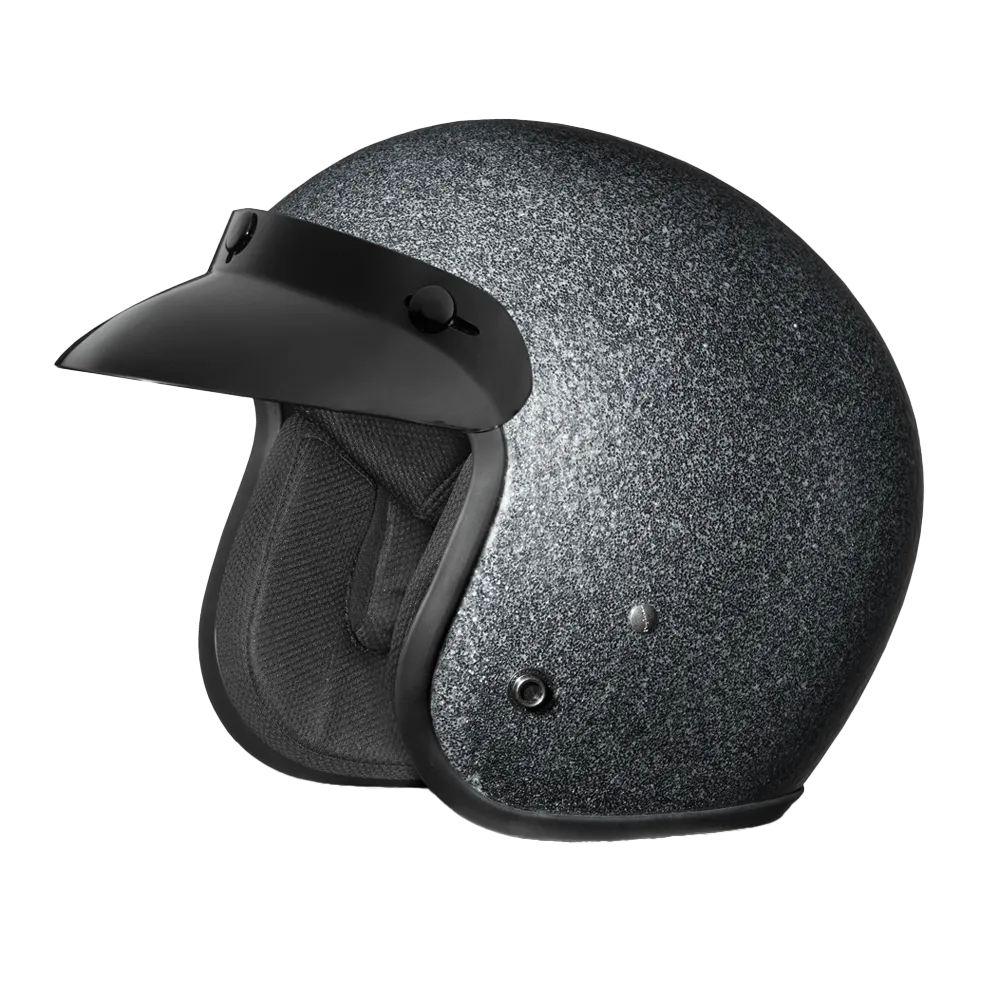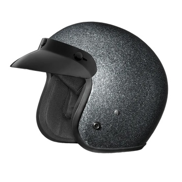 Our D.O.T. Daytona Cruiser 3/4 Shell Helmet In The Gun Metal Flake, Meets And Exceeds D.O.T. FMVSS 218 Standards And Is The Smallest D.O.T. 3/4 Shell Helmet Ever Made!!  With 3 Different Shell Sizes, You're Sure To Get That Proportionate Fit!!  Available Only With Removable, Snap On Gloss Black Bubble Visor.  Many More Colors And Designs Available Such As Soft Touch Dull Black, Hi-Gloss Black And Hi-Gloss White; Custom Colors: Gun Metal Grey Metallic; Specialty Items: Graphics.  Head Wrap And Cloth Draw String Bag Included.  Sizes Range From XS-2XL.