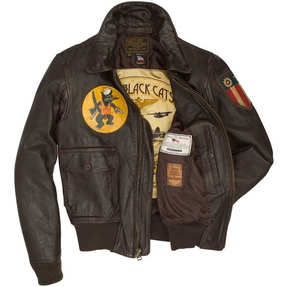 This men's flight jacket from Cockpit USA commemorates the bravery of the pilots and aircrew of the PBY Catalina amphibious seaplane “The Black Eagle”. One of the many PBY aircraft that flew night stealth missions, the squadrons became known as the “Black Cats” during WWII. During the warmer months in the South Pacific, pilots modified their jackets by removing fur collars, adorning them with hand painted back nose art, bomb symbols and aerial victory flags indicating the number of missions the crew endured. Please note that each USN flight jacket is unique and its distress vegetable tanning may vary from production to production.