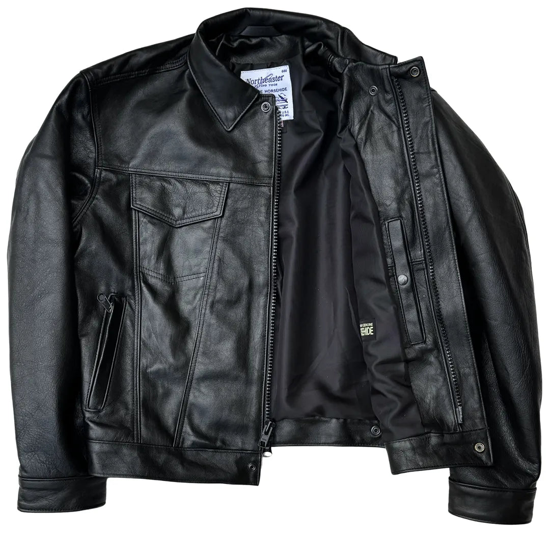 Introducing the BECK® 501 Trucker Style Genuine Horsehide Motorcycle Jacket, perfectly timed to revive the classic denim trucker silhouette with an impeccable blend of vintage 1960s charm and modern craftsmanship tailored for the motorcyclist. This exclusive Horsehide Motorcycle Jacket is meticulously crafted from genuine front quarter horsehide leather, featuring iconic design elements such as pointed chest pockets, iconic vertical seams, and a waist-length fit. The Horsehide Motorcycle Jacket is finished with a covered snap front zipper, a covered snap collar, and exposed snap cuff tighteners, incorporating the distinctive 1960s collar. BECK® Northeaster & Flying Togs have registered US Trademark.