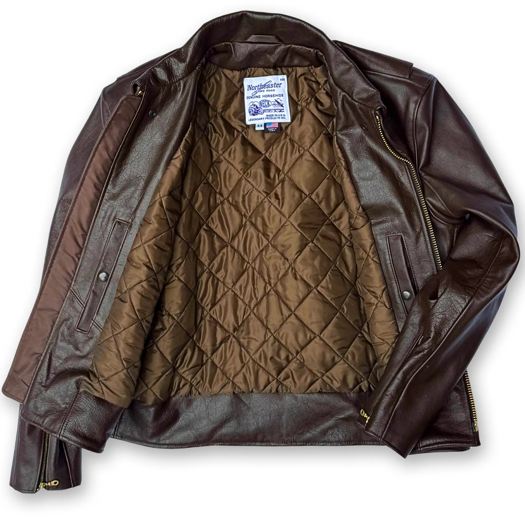Enjoy premium craftsmanship with the BECK® 777 Northeaster Flying Togs Genuine Horsehide Motorcycle Jacket in Chestnut Brown, proudly MADE IN THE USA. Crafted from genuine medium weight horsehide, this jacket exemplifies rugged sophistication. Each horsehide motorcycle jacket undergoes precision hand-cutting and stitching, surpassing industry standards.