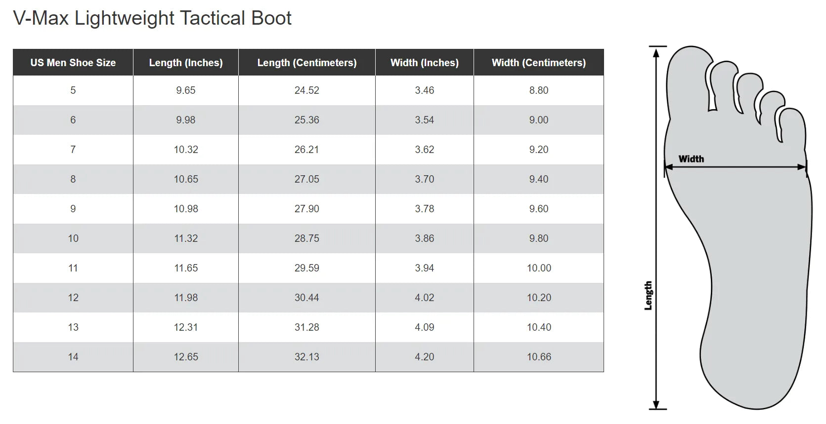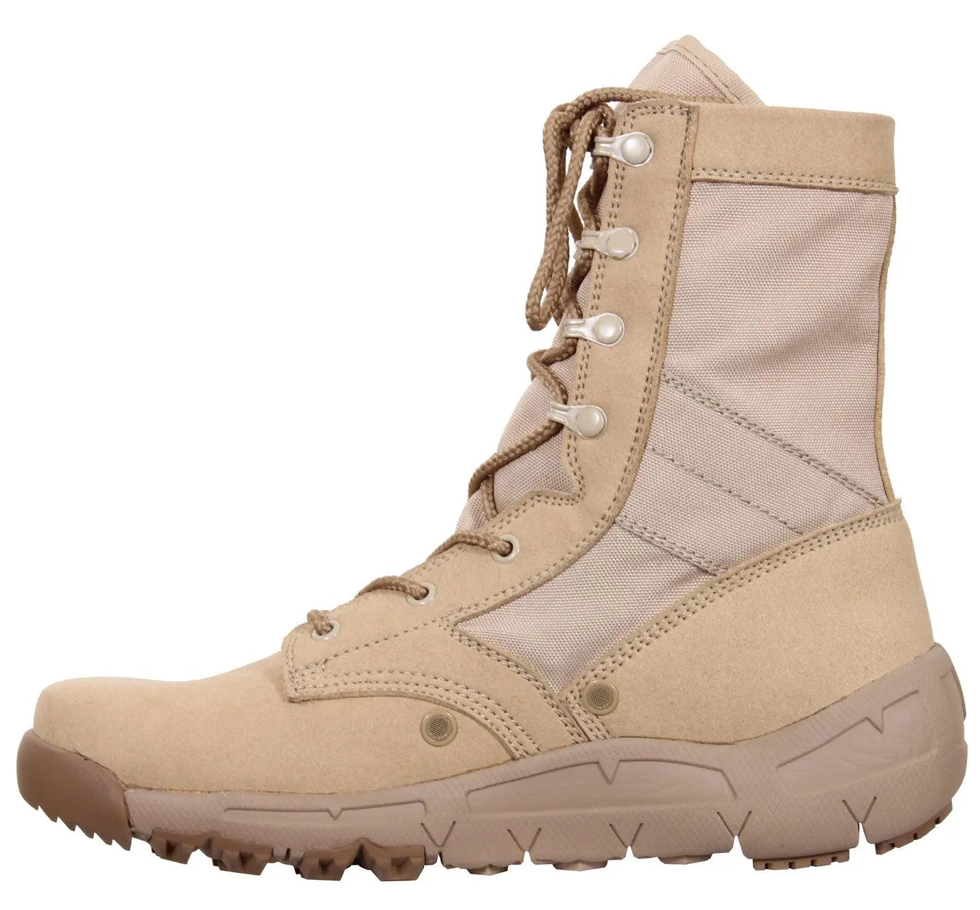 Rothco’s V-Max Lightweight Tactical Boot is the optimal choice for an all-purpose boot. Designed with the comfort and support of a running shoe, the tactical boots feature a rubber and EVA outsole for improved traction while you are on the move. The iron eyelet lace system will keep your lightweight military boots tightly secured. Constructed with a nylon/PU upper and leather body, the sneaker boots are built for long-lasting durability (Desert Sand has a suede body). In addition, the military combat boots include a padded collar for a comfortable fit around your ankle. The interior of the V-max tactical boot contains a removable EVA insole and 2 screen air vents to keep your feet cool. Whether you are in the military, law enforcement, or just looking for a strong work boot, Rothco’s V-Max Tactical Boot is the ideal choice.