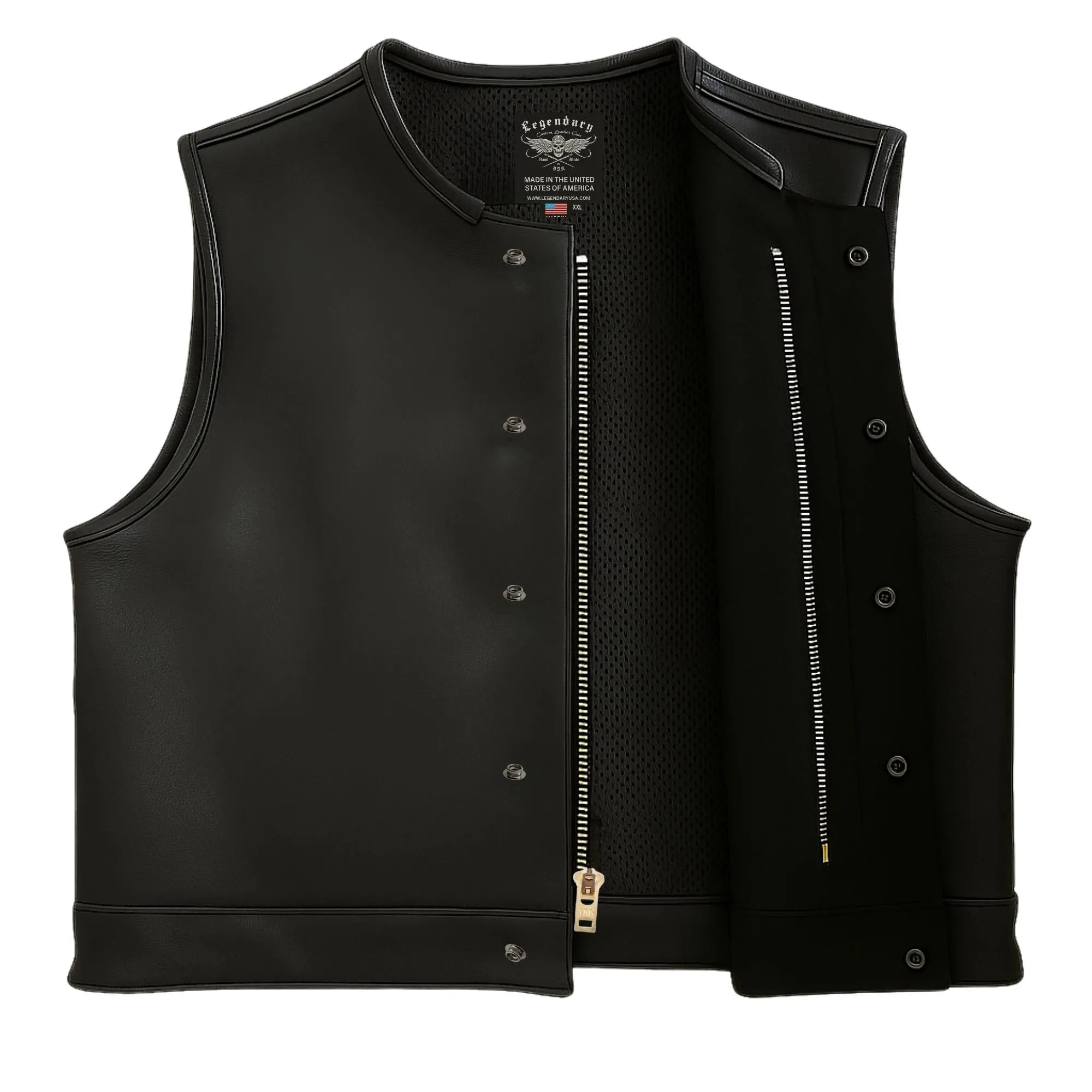 Legendary LowLife NOP Cropped Fitted Leather Club Style Motorcycle Vest in Black is built with a rugged 1.4mm naked cowhide leather for added durability. This vest is 3" inches shorter than the standard Legendary USA vest, offering a more cropped fit for comfort while riding. This is a traditional club vest, with a collarless design, this black leather naked cowhide vest has a one-piece back panel, leather-bound armholes, No Exterior Pockets, and a hidden snap down front with a cropped polished brass YKK zipper. Perfect for concealed carry, it comes with two secure gun pockets with quick-release snap closures. The cropped, sleek design and premium features make it ideal for riders who want style and practicality.
