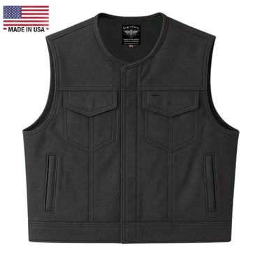 Legendary LowLife Perforated Cropped Leather Motorcycle Vest is built with rugged 1.4mm naked perforated cowhide leather for added durability. This vest is 3" inches shorter than the traditional Legendary USA vest, offering a more cropped fit for comfort while riding. This is a traditional club vest, with a collarless design, the black leather vest has a one-piece back panel, leather-bound armholes, a hidden snap front, and a cropped brass zipper. Perfect for concealed carry, it comes with two secure gun pockets with quick release snap closures. The cropped design and premium features make it ideal for riders who want both style and practicality. Available in Black.