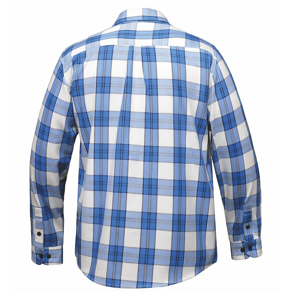 The Men's Blue and White Flannel Shirt by DERRINGER Flannel Co. blends classic style with rugged functionality. Crafted from high-quality cotton, this shirt features a striking blue and white color scheme that complements its robust construction. Perfect for both casual wear and outdoor activities, it combines comfort with durability, making it a versatile addition to any wardrobe.