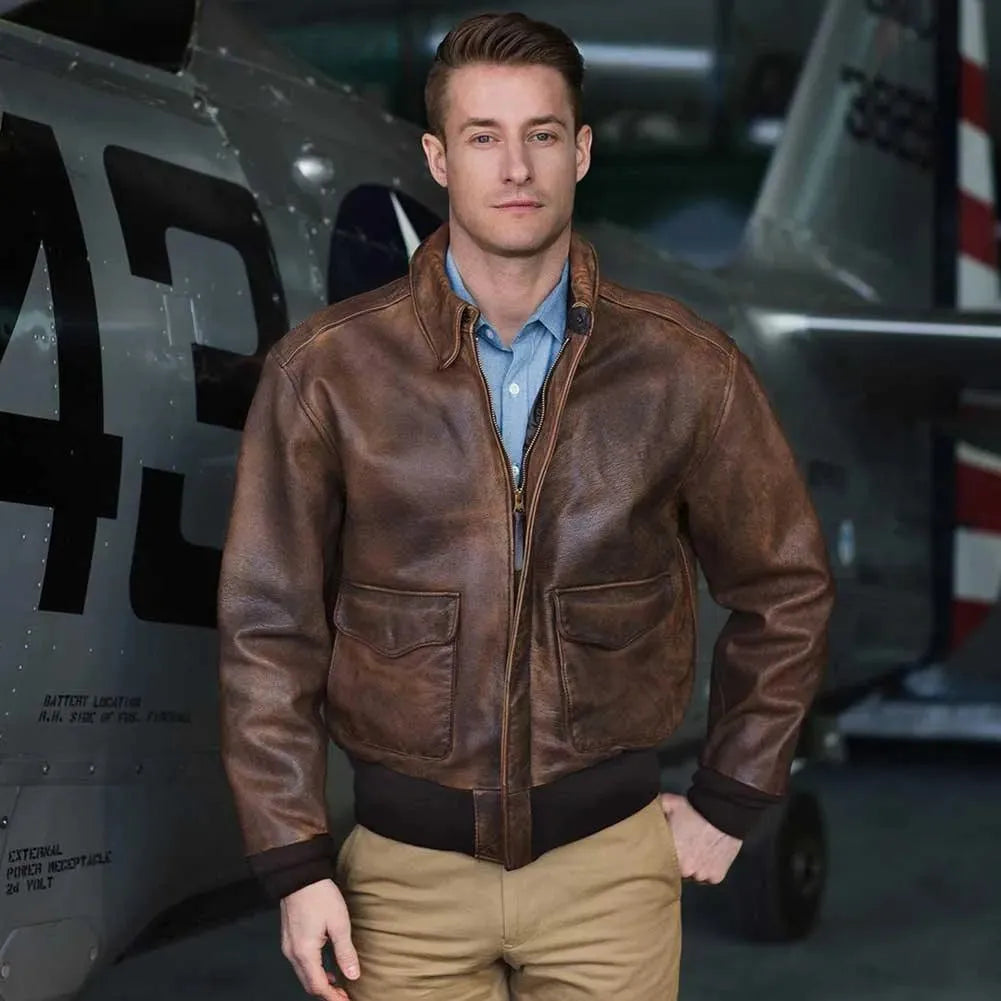 As worn by Steve Carell in the Netflix series SPACE FORCE. Cockpit's new Mustang Vintage A-2 brown leather flight jacket is made of supple, specially treated vegetable tanned goatskin. The Mustang jacket goes through an extensive vintaging process to make it look like it has gone through 200 missions. As a result, no two vintage Mustang jackets are exactly the same. Get that weathered, battle worn vintage look without waiting for the jacket to break in.