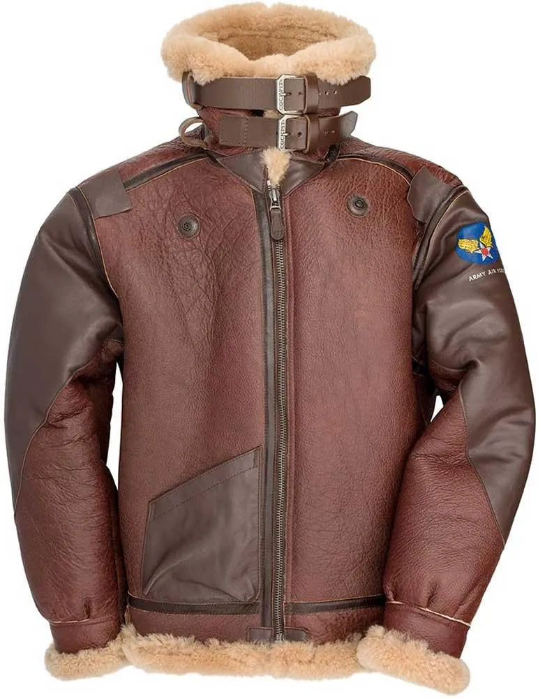 Designed for authenticity, this B-3 features classic wartime construction details including a single horsehide map pocket on the front, horsehide-reinforced sleeves for abrasion resistance, and shoulder tabs for attaching officer rank. The left sleeve carries a WWII-era Army Air Force decal, while the heavy latigo leather belting straps at the collar and waist replicate the rugged functionality airmen depended on during freezing high-altitude missions.