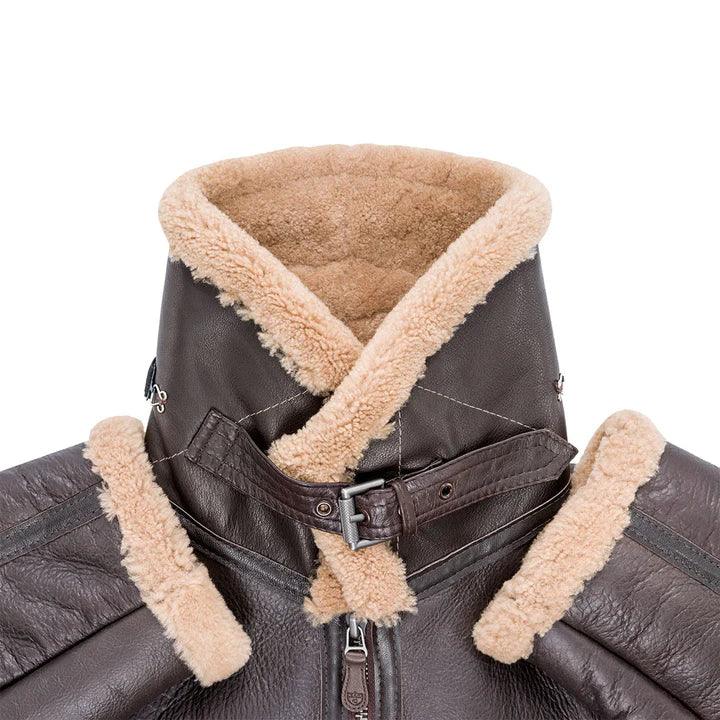 The shearling naturally develops an “antiqued” patina as you wear it, creating highs and lows in the wool that mimic the look of a true WWII-era jacket. Reinforced leather seams, a buckle throat latch, underarm grommets, and a waist belt add functional military detailing, while side-entry pockets and interior storage keep it practical for modern use.