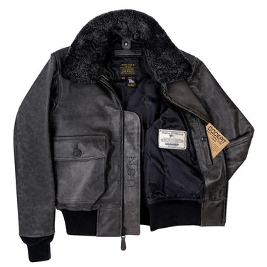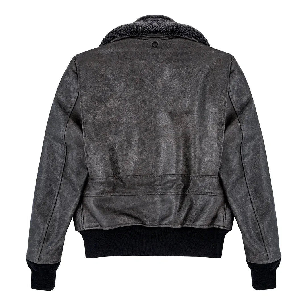 The Shadow G-1 features a removable snow-top mouton fur collar that adds rugged contrast to the distressed black leather, delivering both warmth and unmistakable style. A bi-swing back provides superior mobility, while the oxidized Mil-Spec black zipper, perforated “USN” windflap, and classic flap pockets reinforce its naval aviation roots. Inside, a poly twill lining offers comfort and durability for everyday wear.