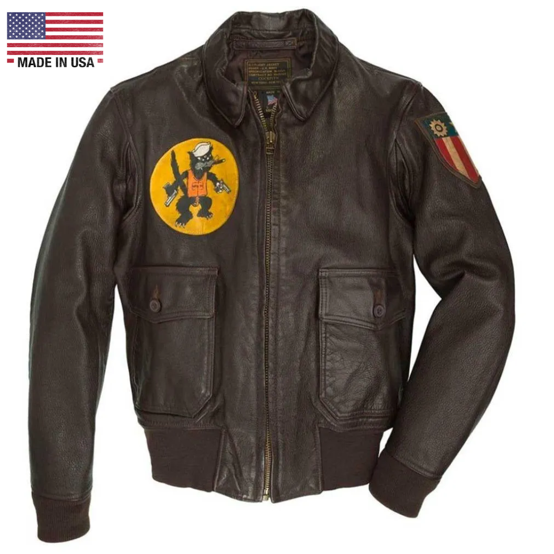 Inspired by the courageous night crews of the PBY Catalina “Black Eagle,” the Cockpit USA WWII South Pacific Pilots Jacket honors the stealth squadrons known as the Black Cats—aviators who flew low, dark, and dangerous missions across the Pacific. This hand-finished goatskin jacket captures the exact look of the modified WWII originals, complete with historically accurate patches, nose art, and a distress-tanned leather finish that makes each jacket unique. Built with classic naval flight details and a vintage silhouette, it delivers a powerful tribute to America’s unsung WWII aviators.