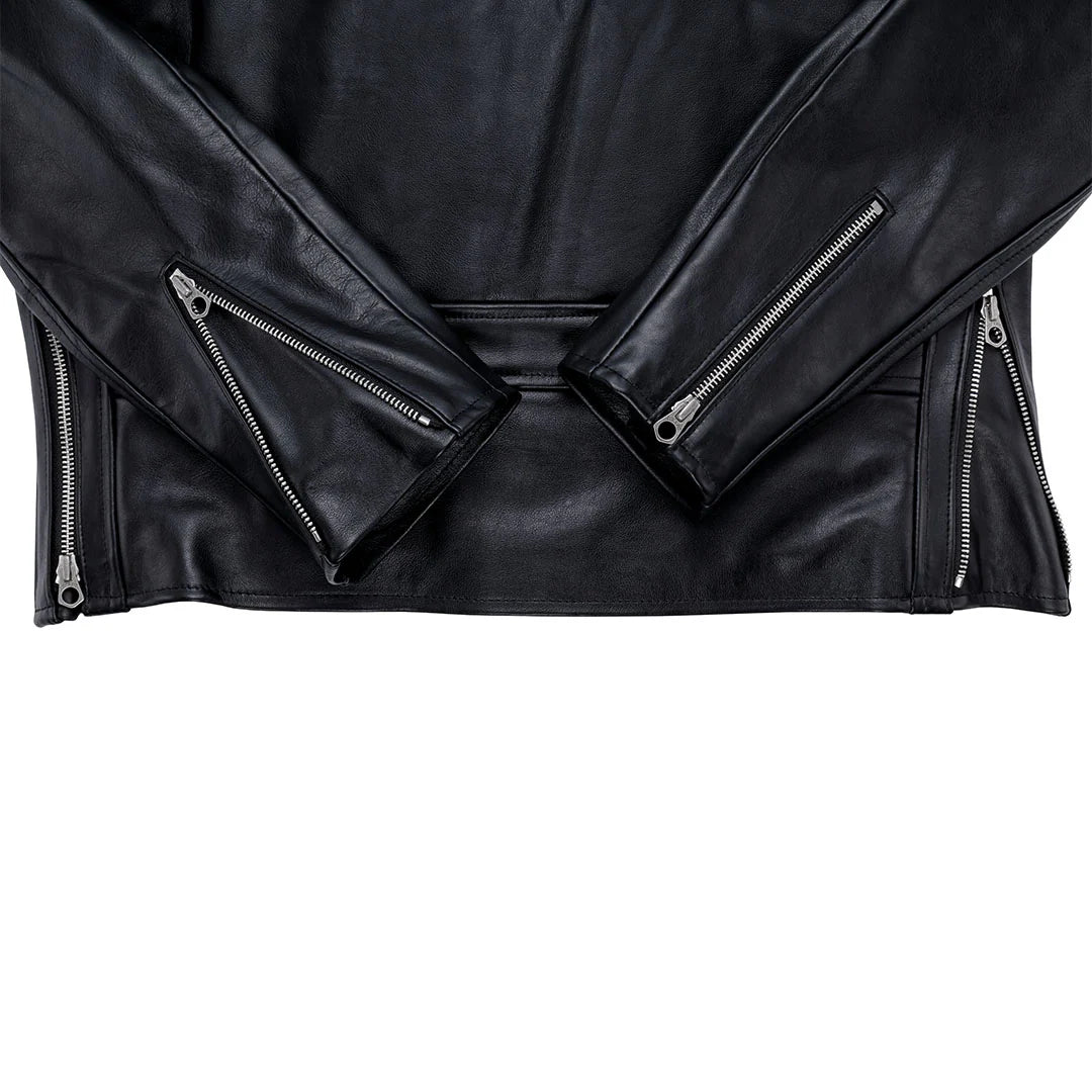 Every detail—from the sturdy horsehide exterior to the bi-swing back—was designed for both durability and mobility. Zippered side-entry pockets, a zippered breast pocket, and a snap-close utility pocket offer practical storage, while the period-correct hardware and silhouette complete the vintage authenticity. This is not a fashion jacket—it’s a piece of American moto history rebuilt for riders who appreciate the real thing.