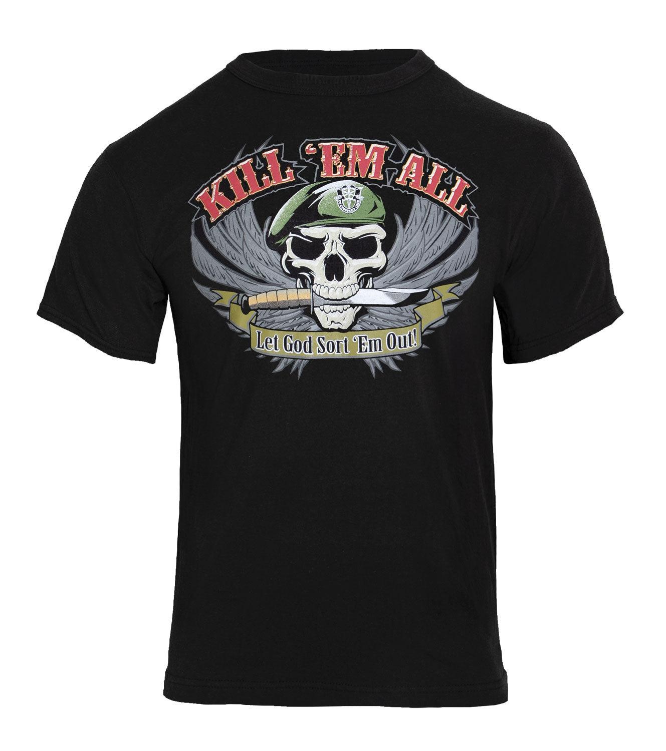 - Front Of This Printed Tee Features A Skull With Green Beret And Knife In Teeth With Wings In Background Graphic And Text Reading “Kill “Em All” And “Let God Sort ‘Em Out!”