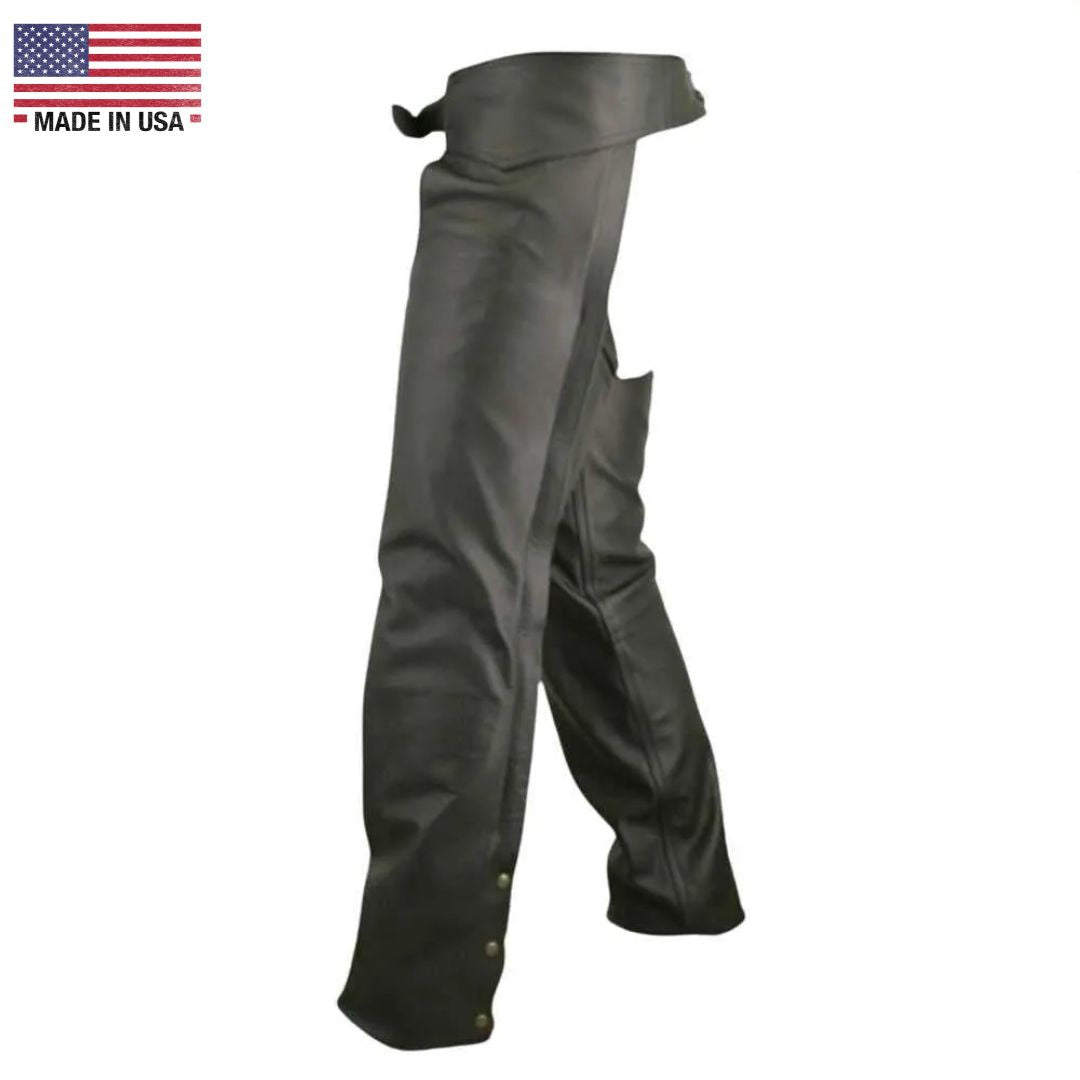 Crafted from premium 1.6-1.8 mm (4-41/2 oz.) soft, supple, and thick cowhide naked leather, these chaps offer superior protection and comfort. The double stitching adds an extra layer of durability, reinforcing the chaps' structure and enhancing their longevity. Engineered to withstand the demands of the open road, these chaps will accompany you on countless adventures, providing reliable protection against the elements.
