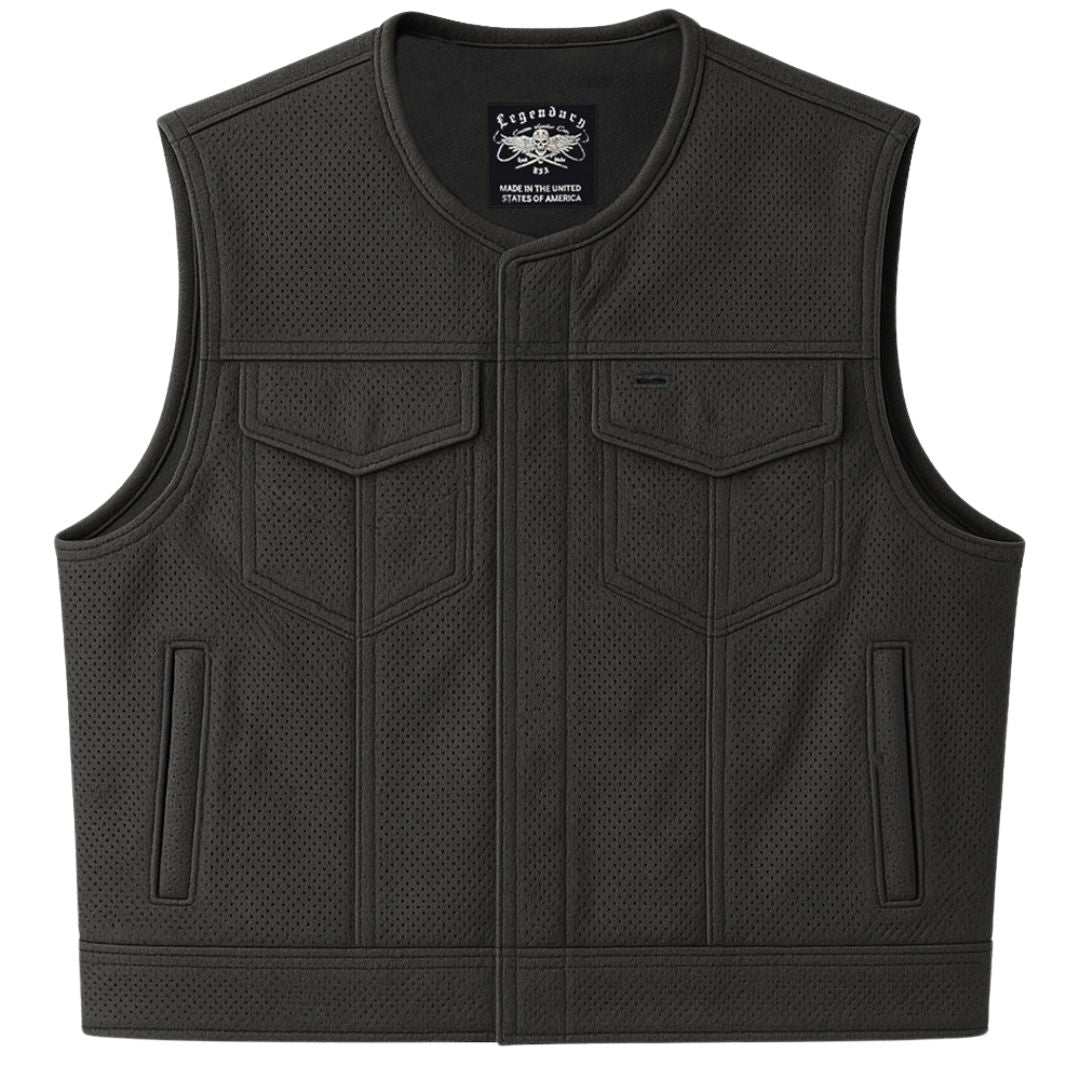 Legendary LowLife Perforated Cropped Leather Motorcycle Vest is built with rugged 1.4mm naked perforated cowhide leather for added durability. This vest is 3" inches shorter than the traditional Legendary USA vest, offering a more cropped fit for comfort while riding. This is a traditional club vest, with a collarless design, the black leather vest has a one-piece back panel, leather-bound armholes, a hidden snap front, and a cropped brass zipper. Perfect for concealed carry, it comes with two secure gun pockets with quick release snap closures. The cropped design and premium features make it ideal for riders who want both style and practicality. Available in Black.
