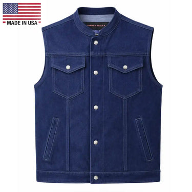 Our Legendary 'Ole Blue' American-made Blue Denim Motorcycle Vest. We proudly present the Legendary Blue Revolution Men's Denim Motorcycle Vest, constructed of pre-rinsed blue denim made entirely in the USA.